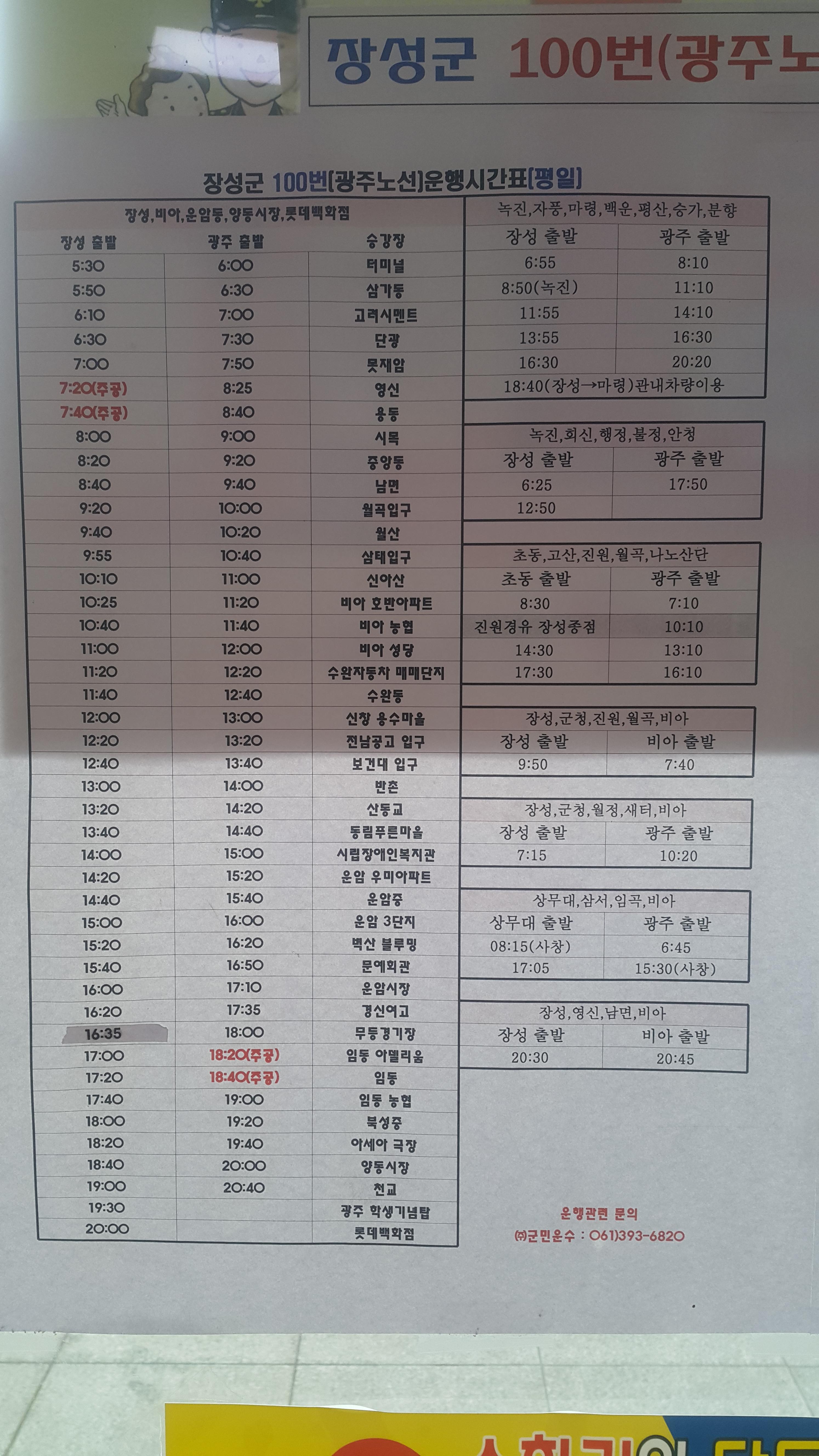 장성군 100번 노선 시간표(평일)