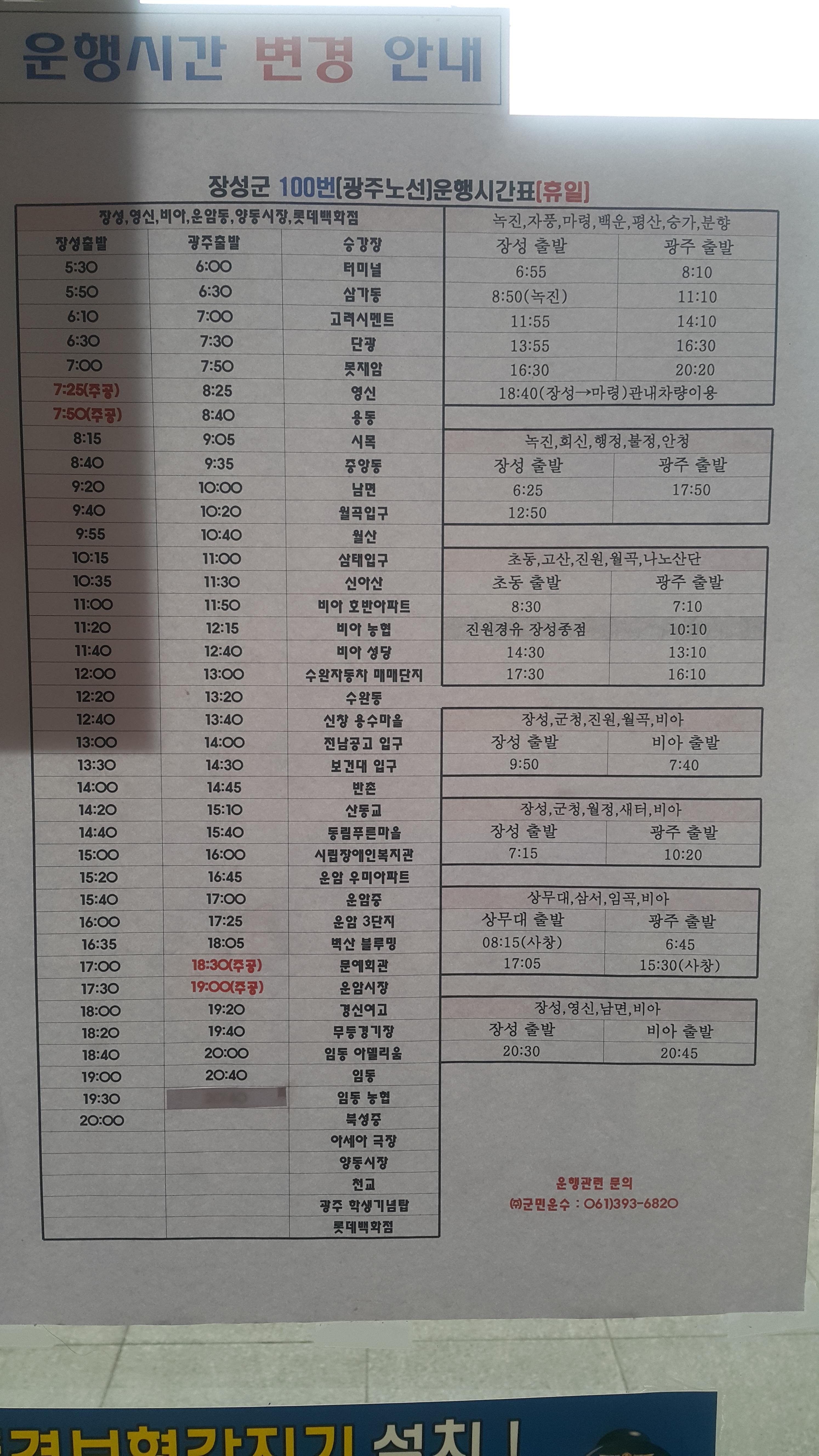 장성군 100번 운행시간표(휴일)