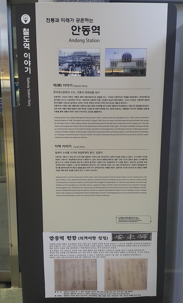또한 퇴계 이황의 매화시첩에서 따온 한자로 구성된 옛 안동역 현판을 역사 내부에 보존하고,