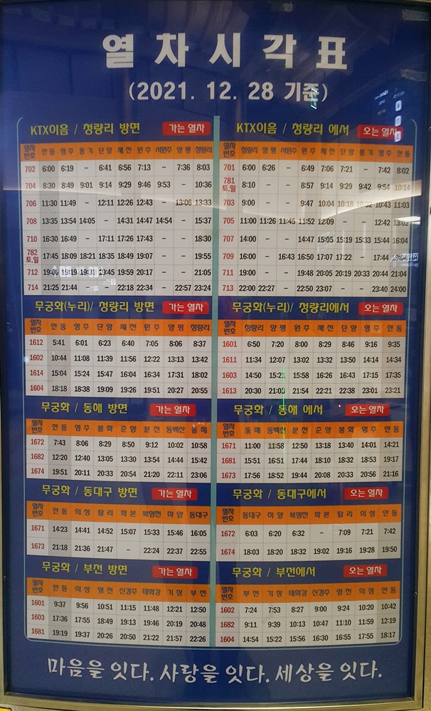 안동역 출발 청량리, 동해, 동대구, 부전 방면