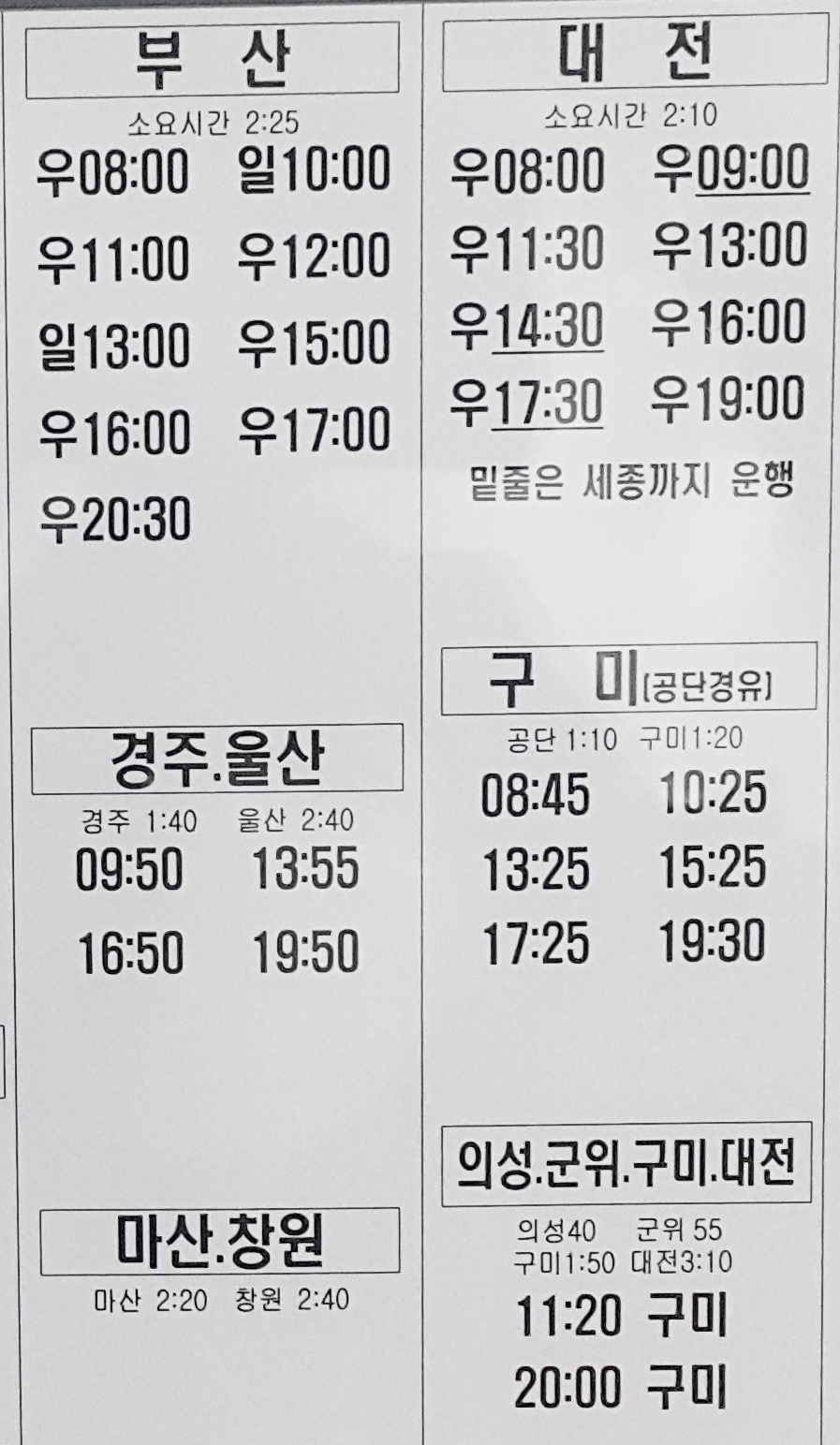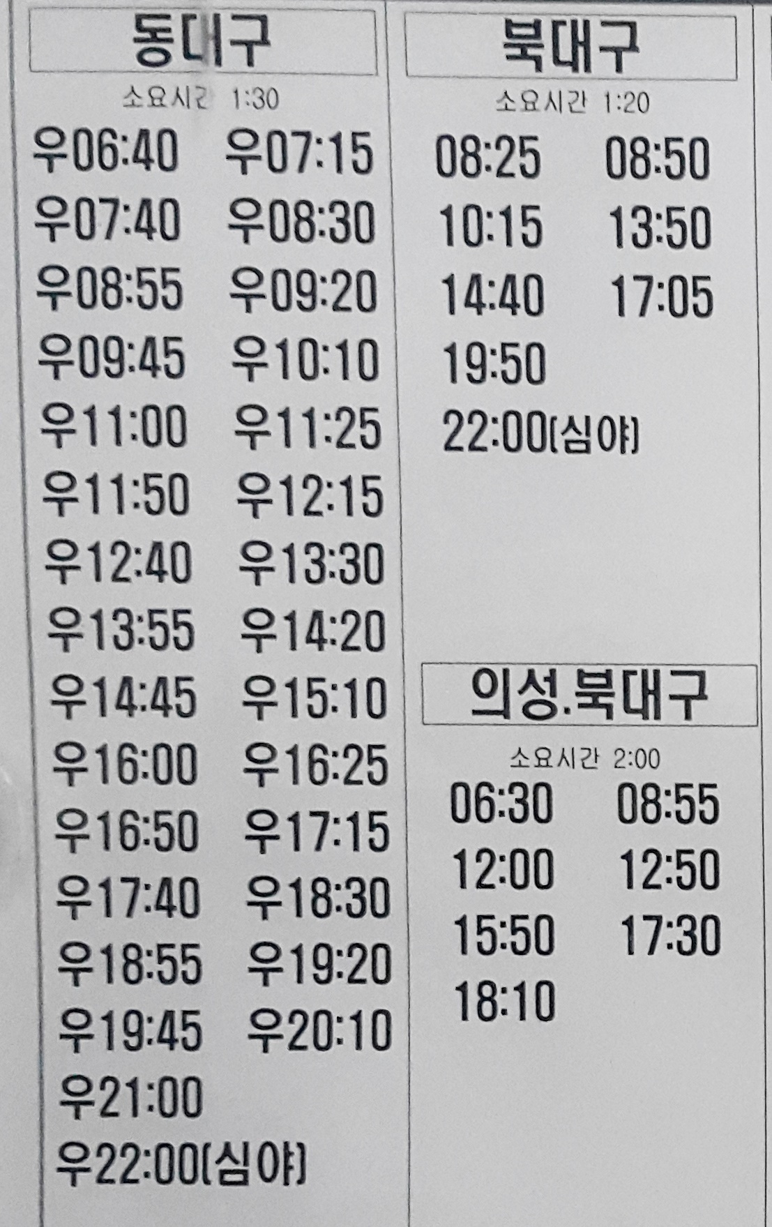 안동 출발 부산, 대전, 경주, 울산, 구미, 마산, 창원, 의성, 군위, 대전 방면.