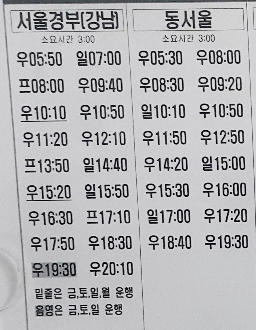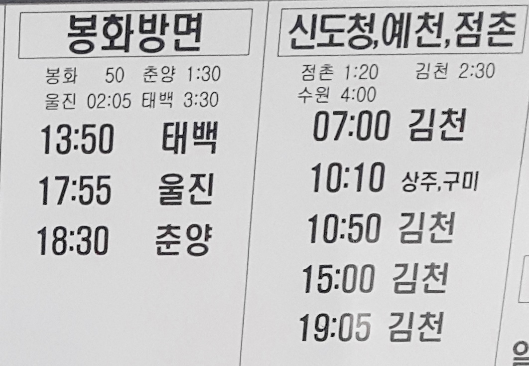안동 출발 청주, 예천, 원주, 영주, 강릉, 속초 방면.