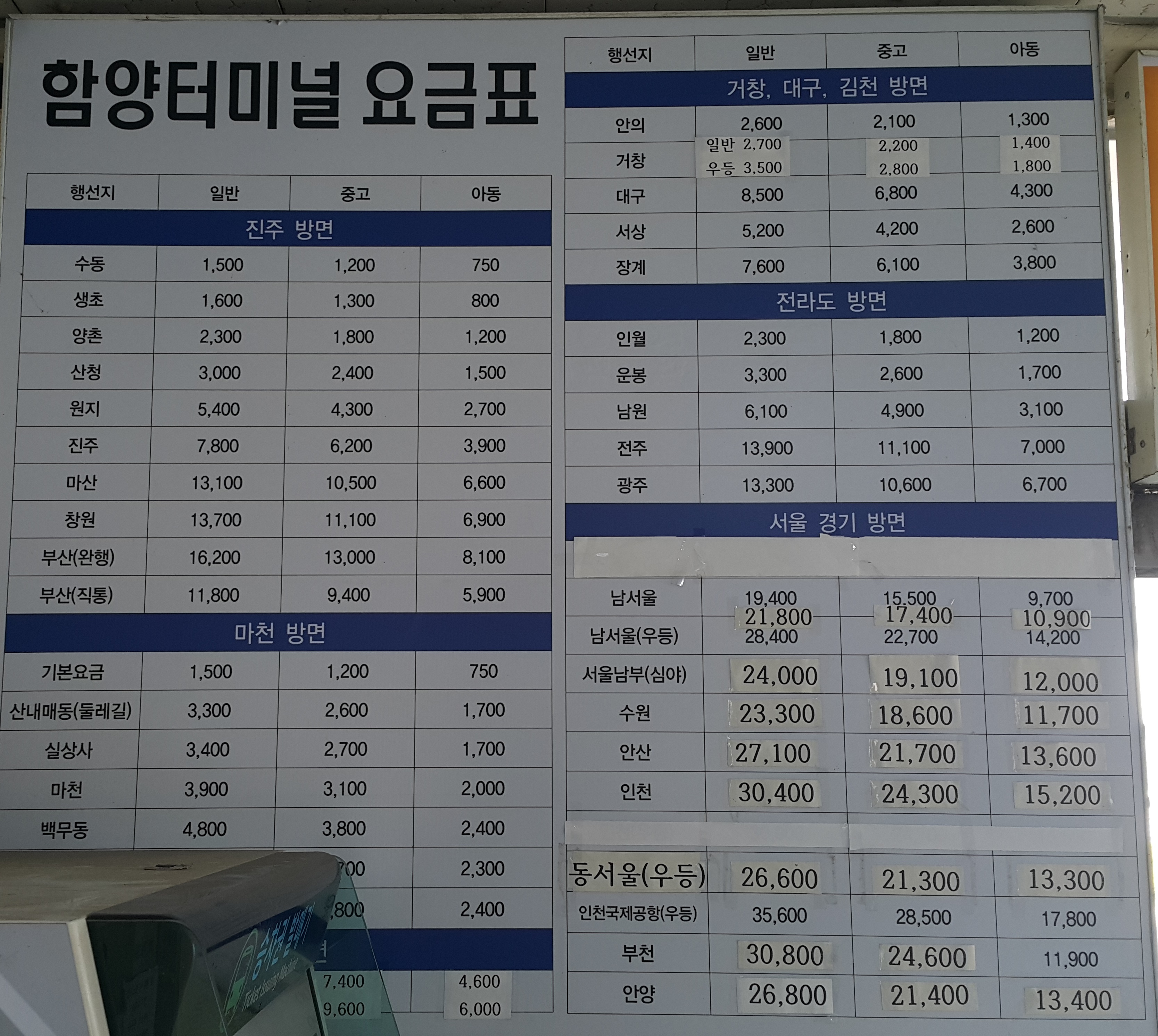 함양시외버스터미널 요금표.