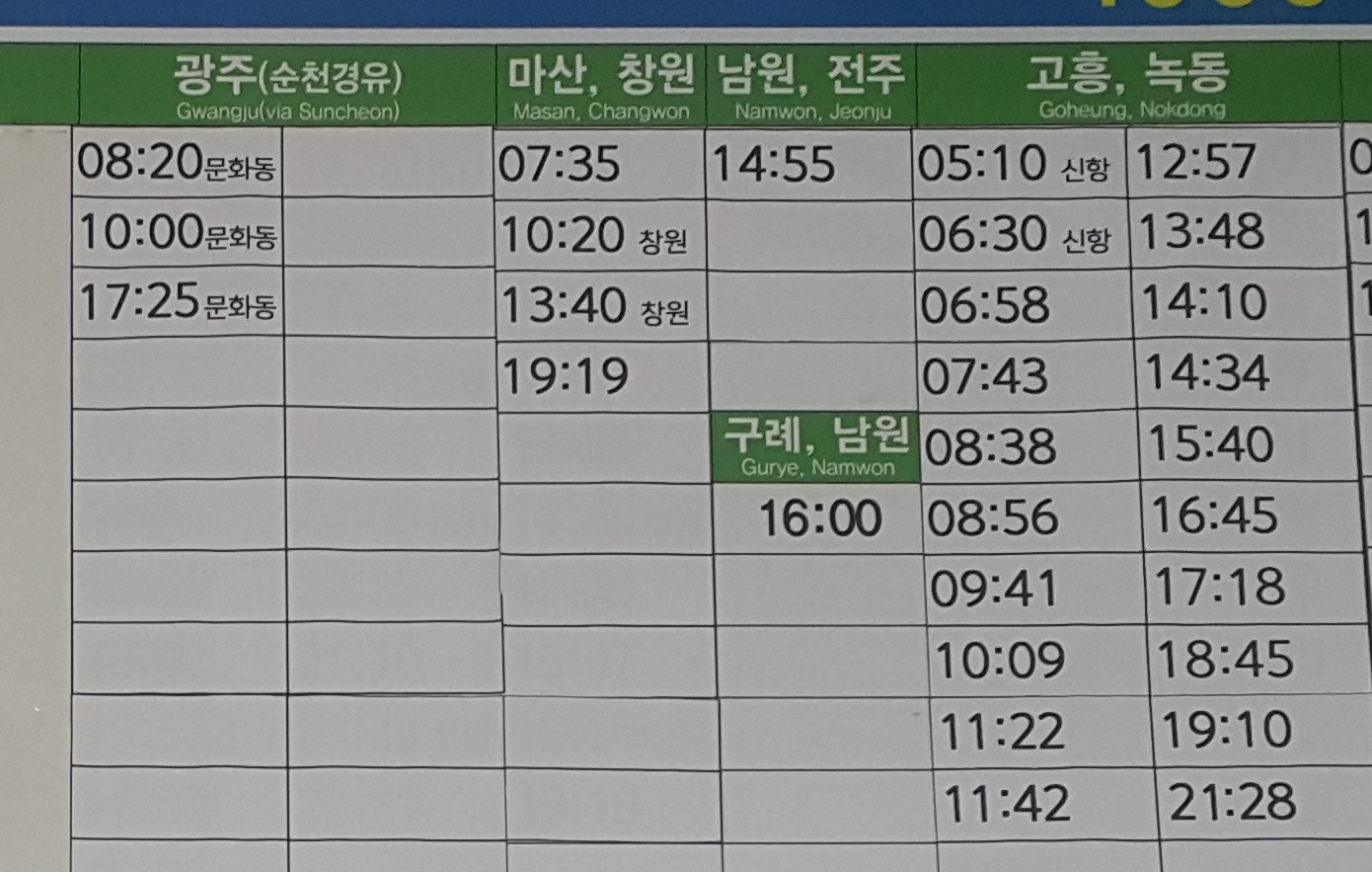 여천 불발 광주 마산, 창원, 남원, 전주, 구례, 남원, 고흥, 녹동 방면.