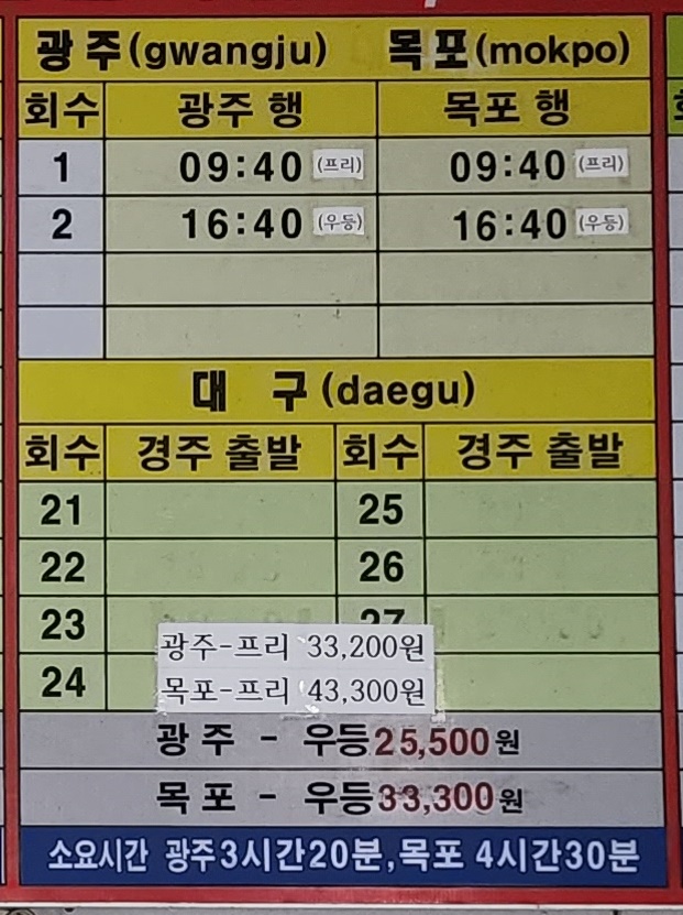 경주 출발 대구, 광주, 목포 방면.