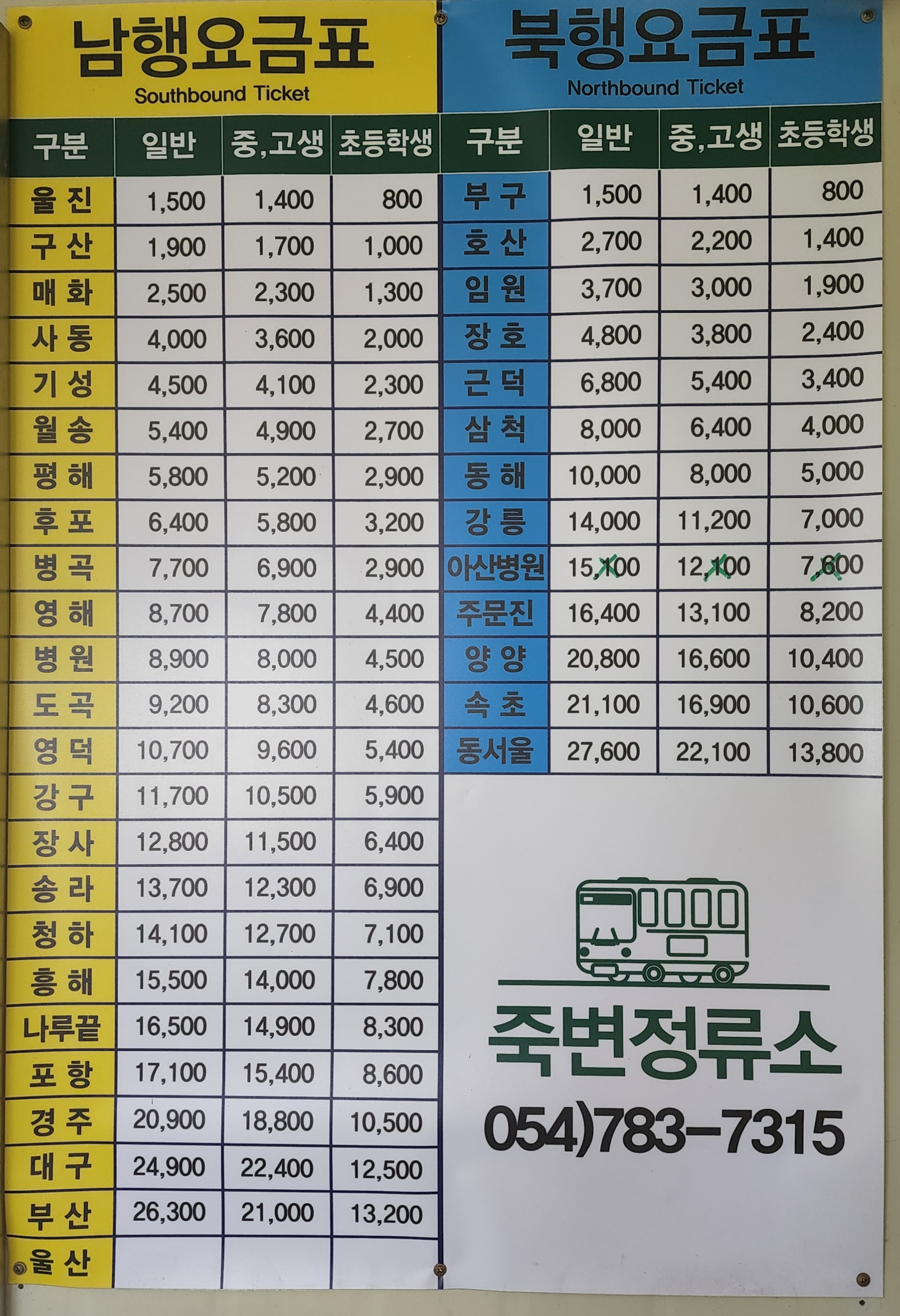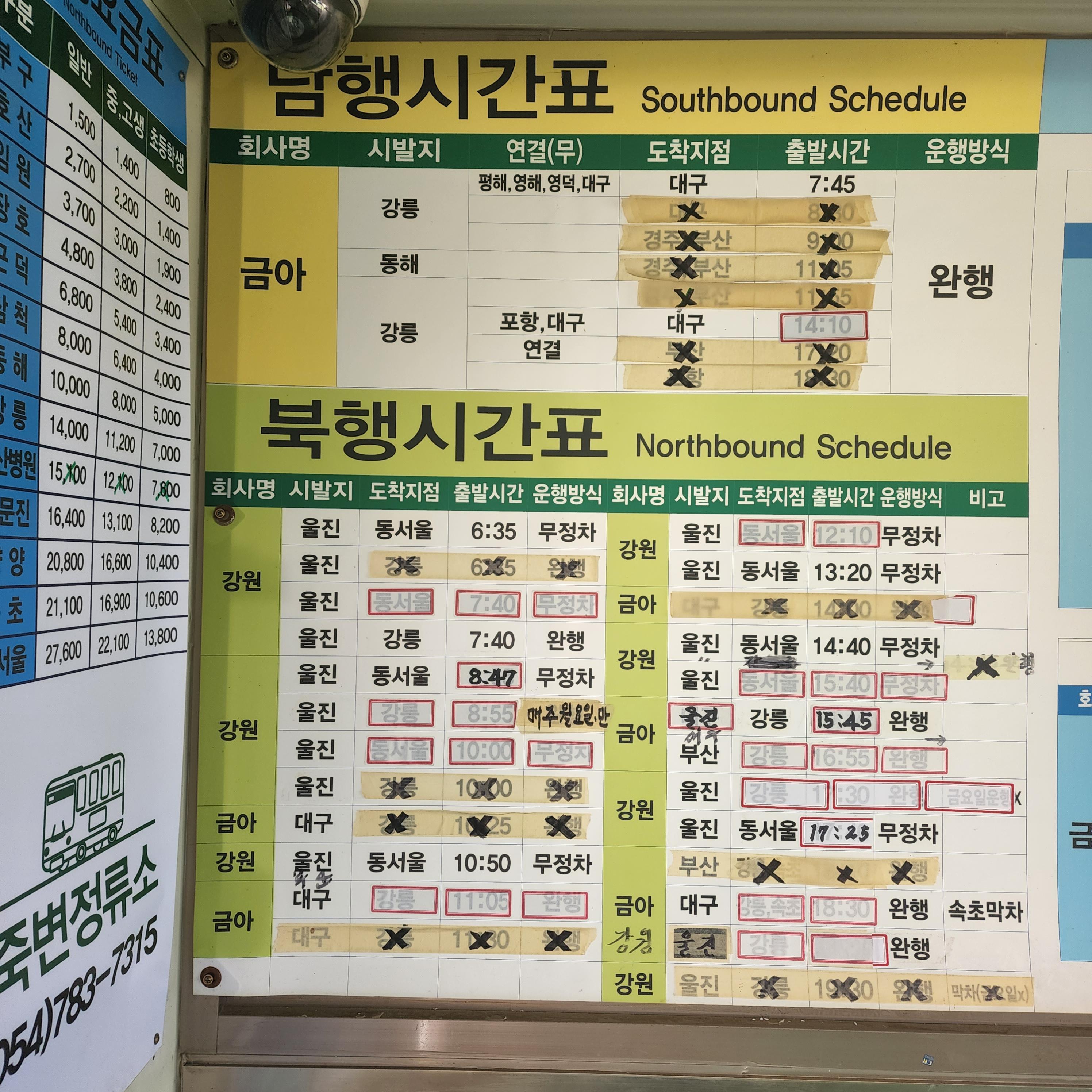 죽변시외버스터미널 요금표