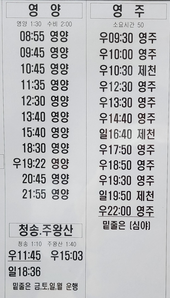 안동 출발 영양, 청송, 주왕산, 영주 방면