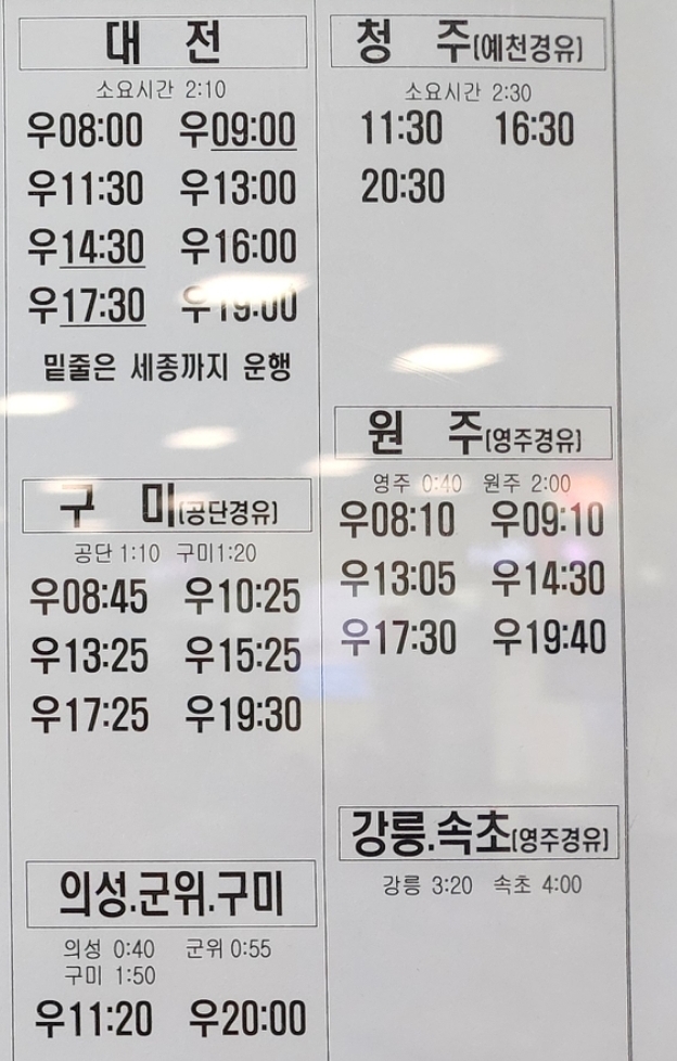 안동 출발 대전, 청주, 구미, 의성, 군위, 원주, 강릉, 속초 방면