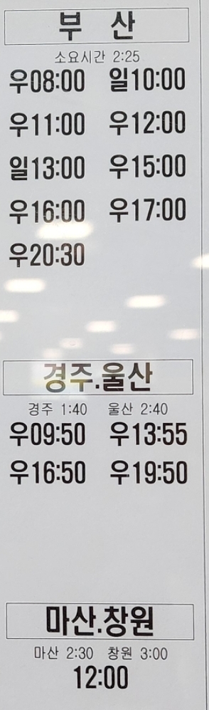 안동 출발 부산, 경주, 울산, 마산, 창원 방면