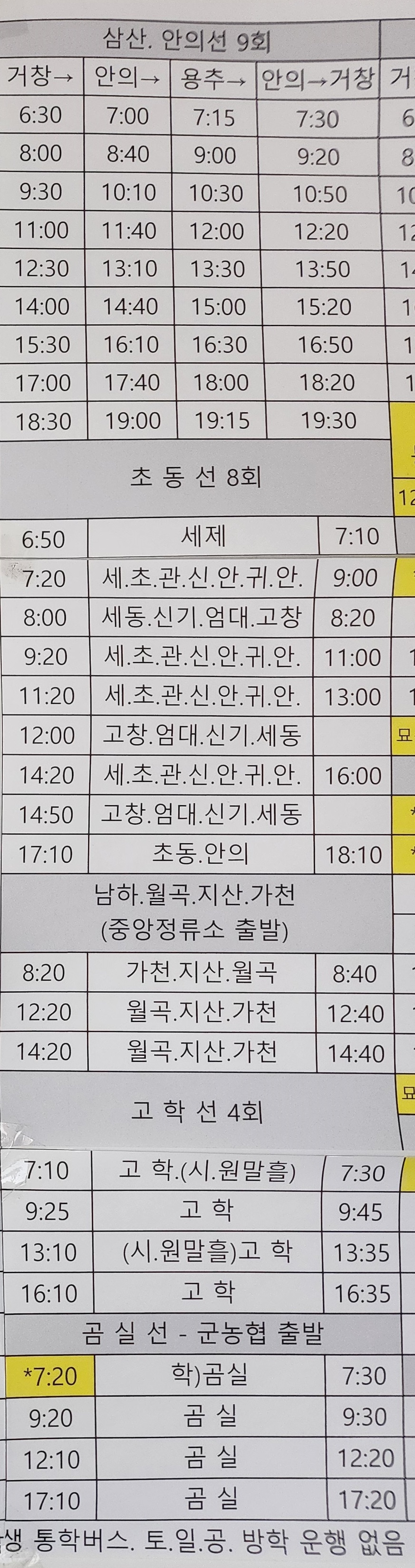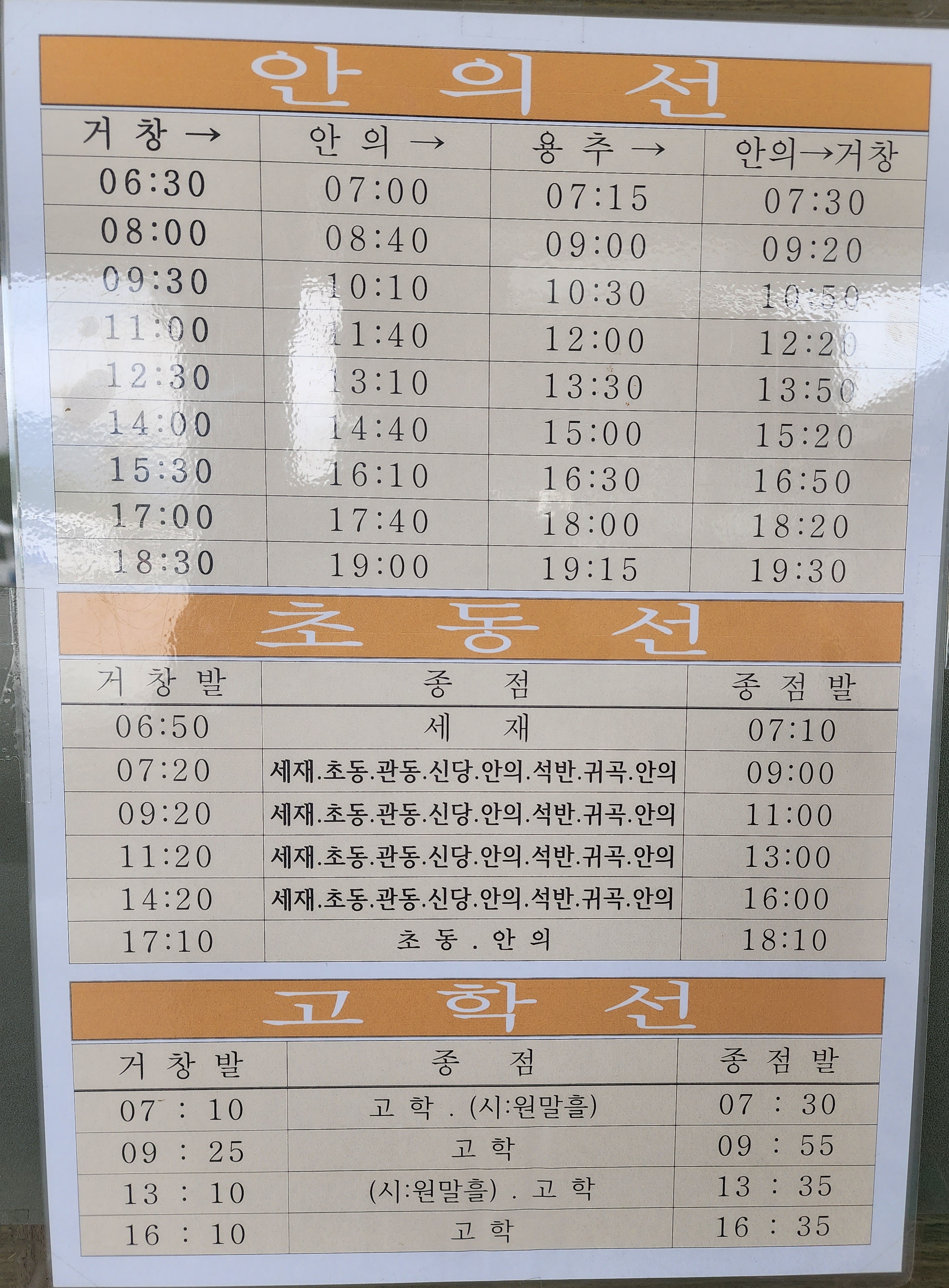 거창 출발 안의, 용추, 세동, 신기, 엄대, 고창, 월곡, 지산, 가천, 고학, 곰실 방면.