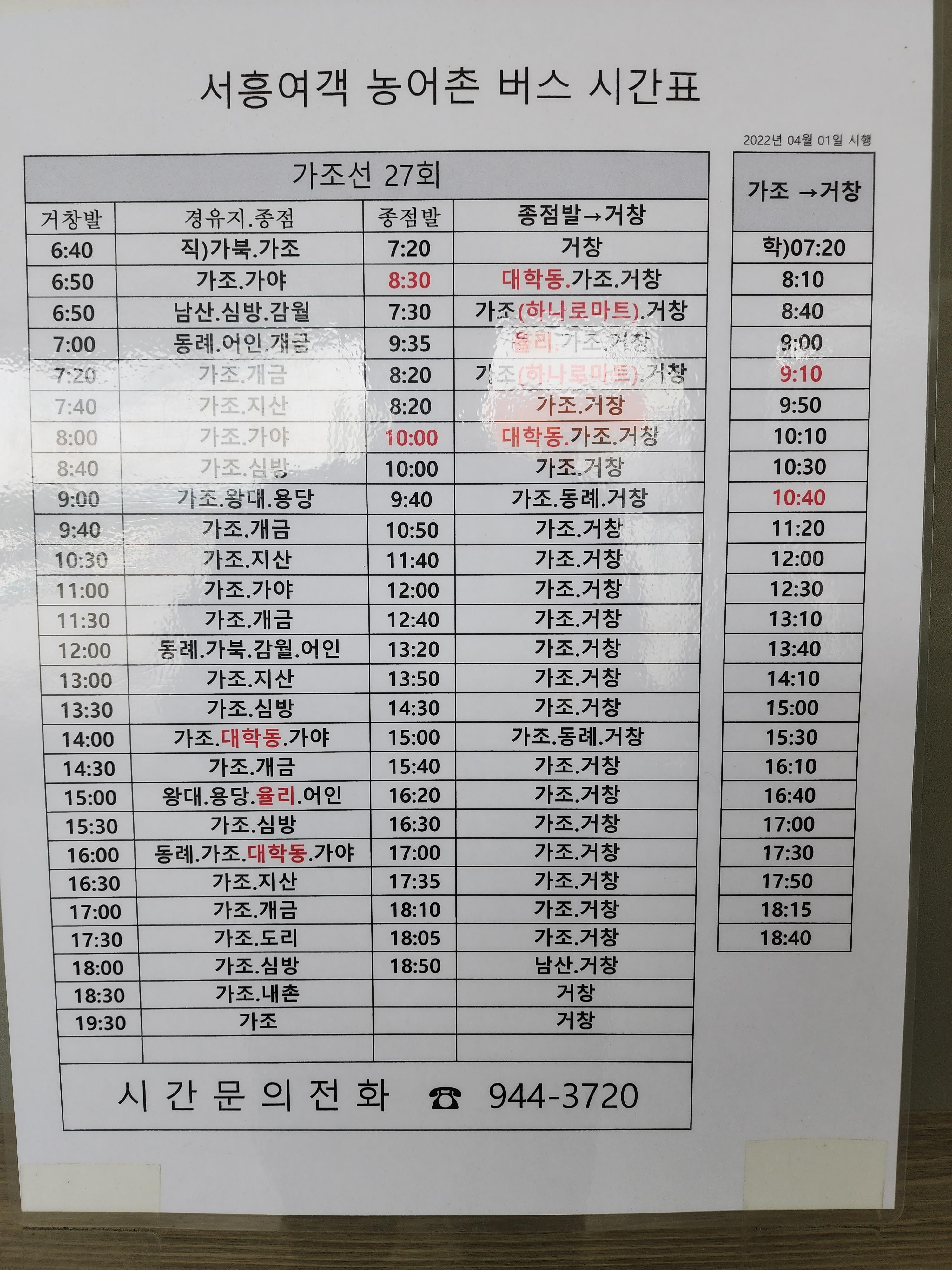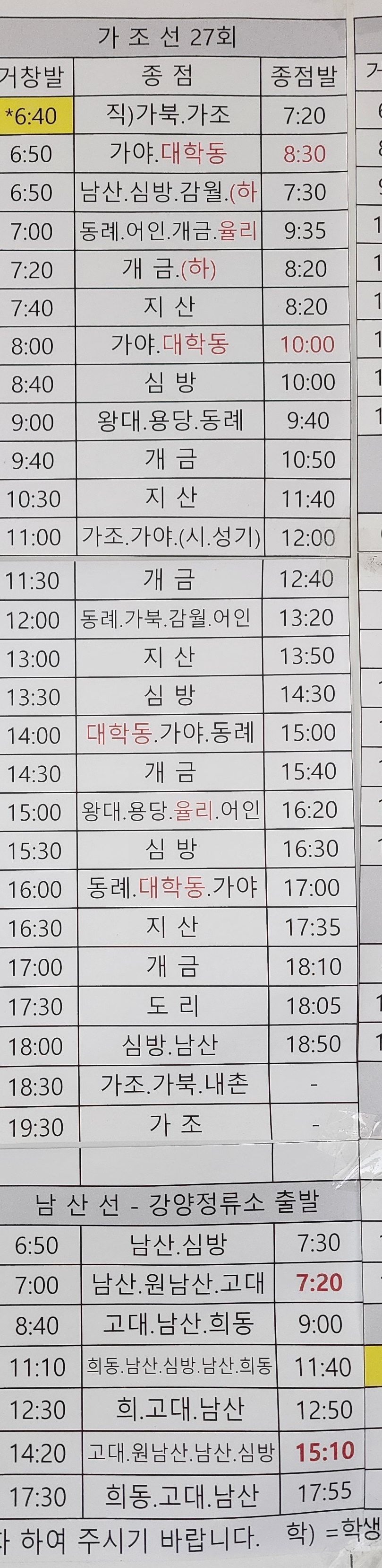 거창 출발 가북, 가조, 가야, 대학동, 남산, 심방, 감월, 동례, 어인, 개금, 율리, 지산, 왕대, 용당 방면.