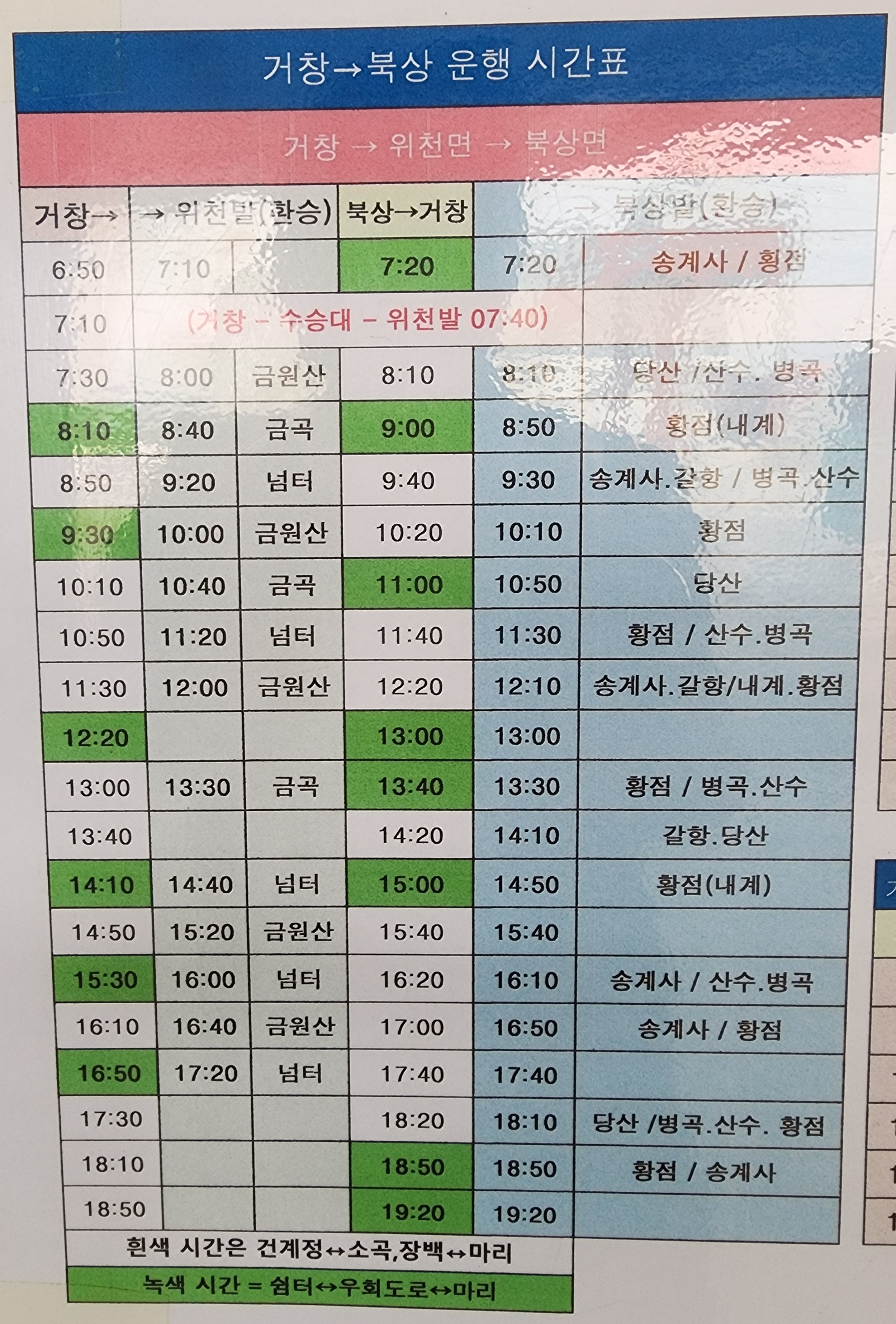 겨창 출발 송계, 황점, 수승대, 위천, 금원산, 당산, 산수, 병곡, 내계, 금곡, 넘터, 갈항, 당산, 둔동, 춘전 방면.
