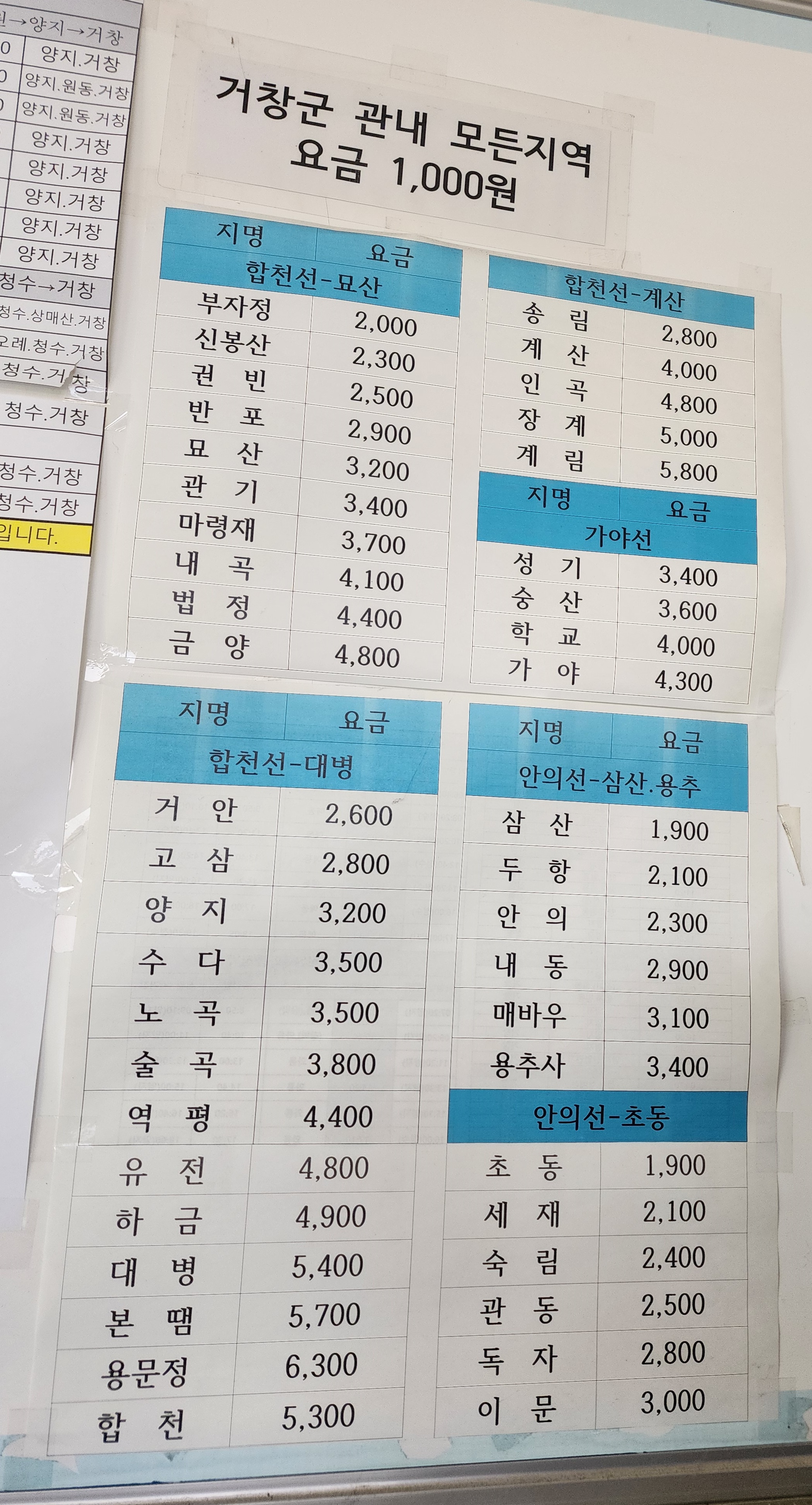 거창 출발 묘산, 가산, 합천, 봉산, 계산, 대병, 아주, 내곡, 방면