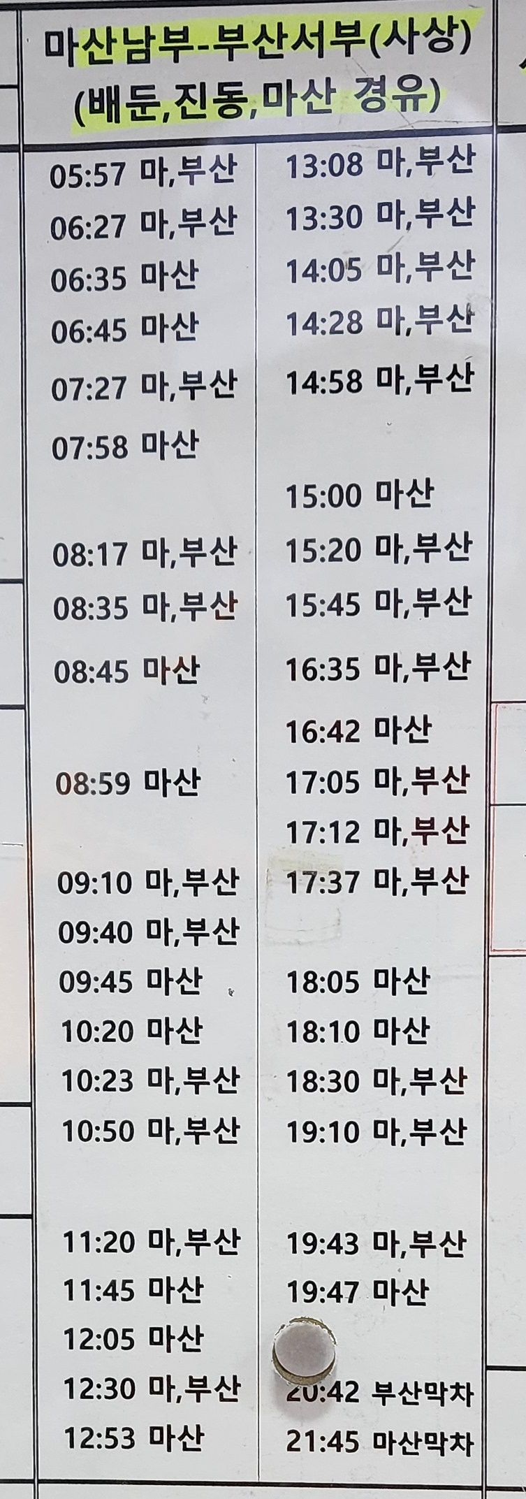 고성 출발 마산 남부, 부산 서부 사상 배둔, 진동, 마산 방면.