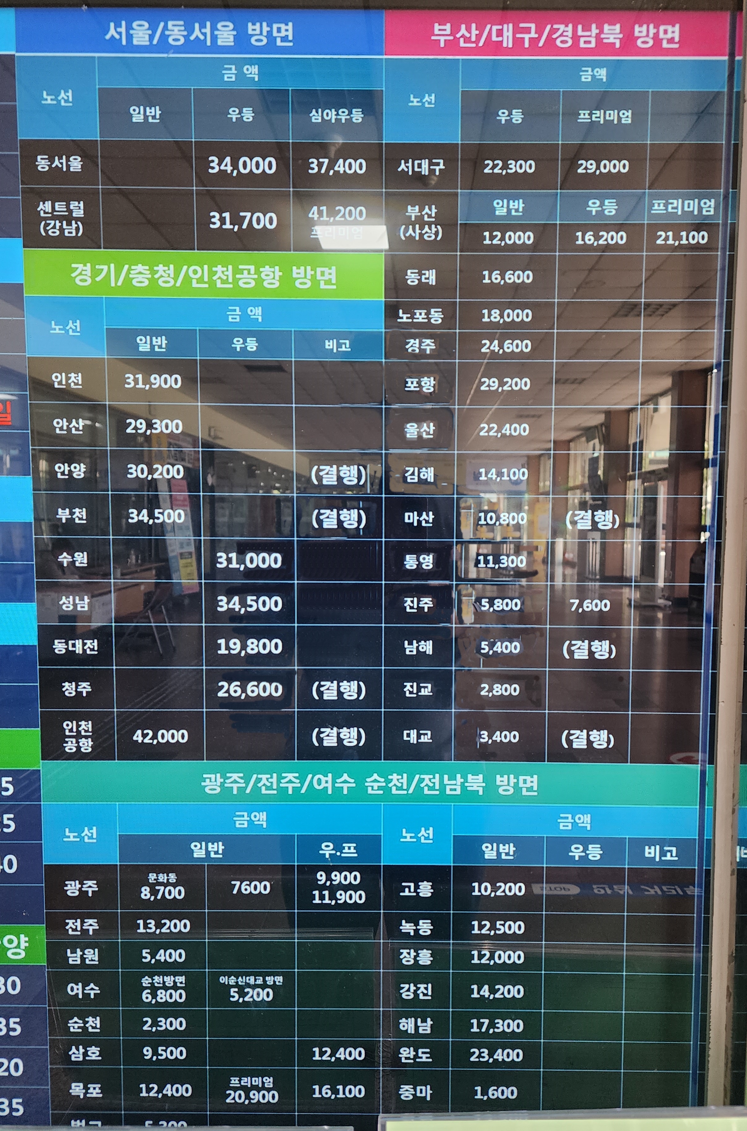 광양 출발 센트럴시티 강남, 동서울, 안산, 인천, 수원, 성남, 대전 대전 복합, 전주, 광주, 목포, 삼호, 남악 방면.