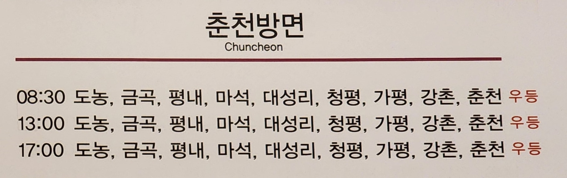 천안 출발 춘천 방면