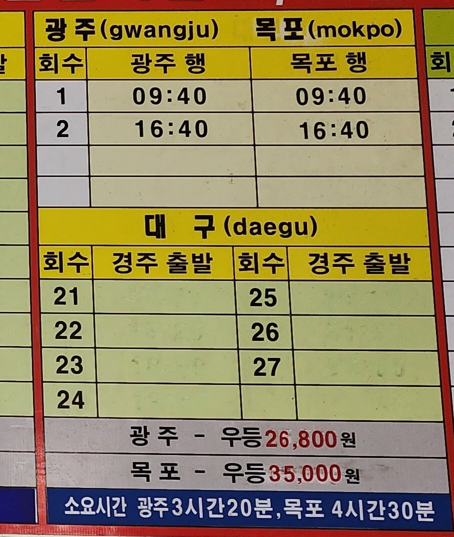 경주 출발 광주, 목포 방면.