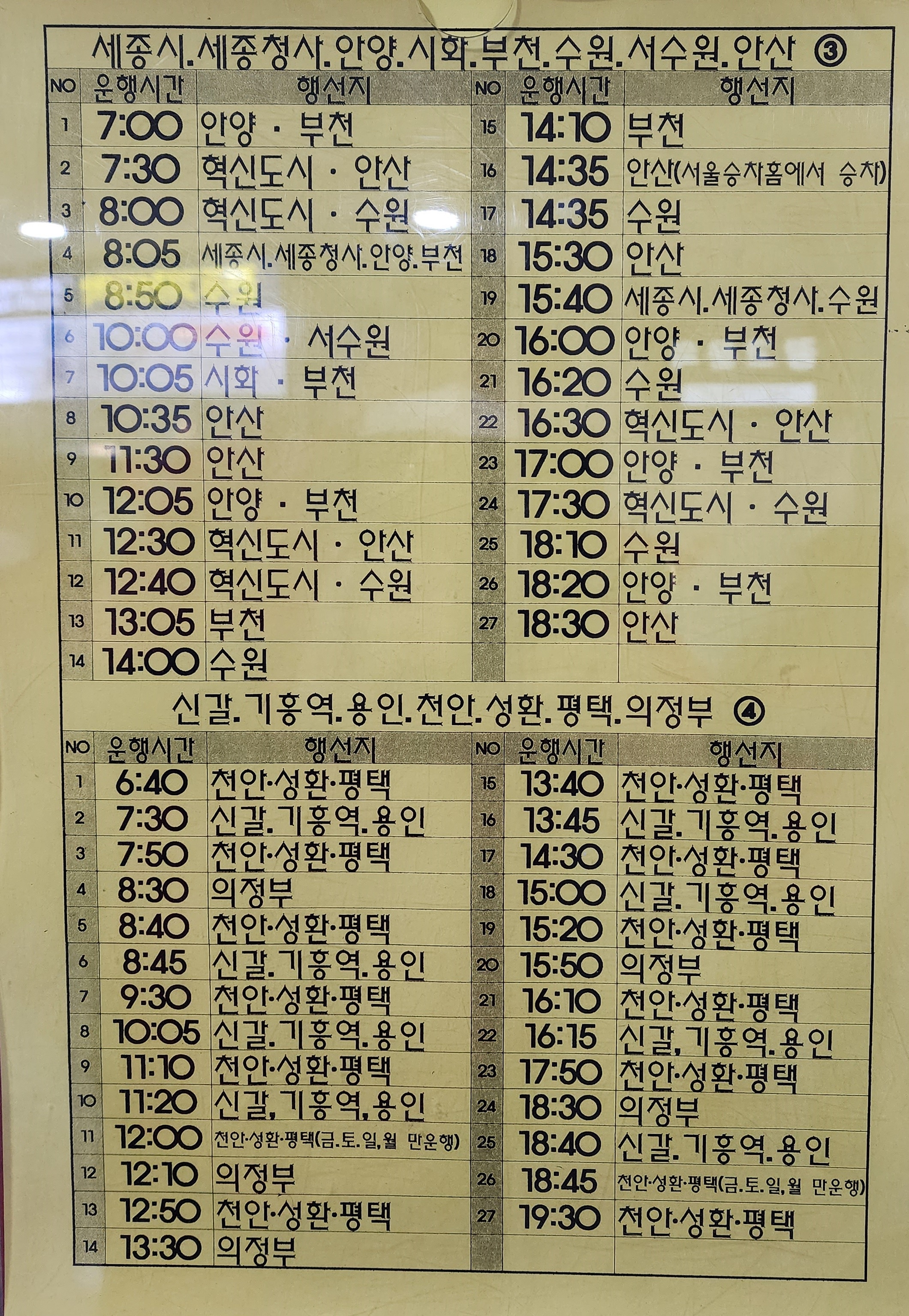 전주 출발 세종시, 세종청사, 안양, 시화, 부천, 수원, 서수원, 안산 방면.