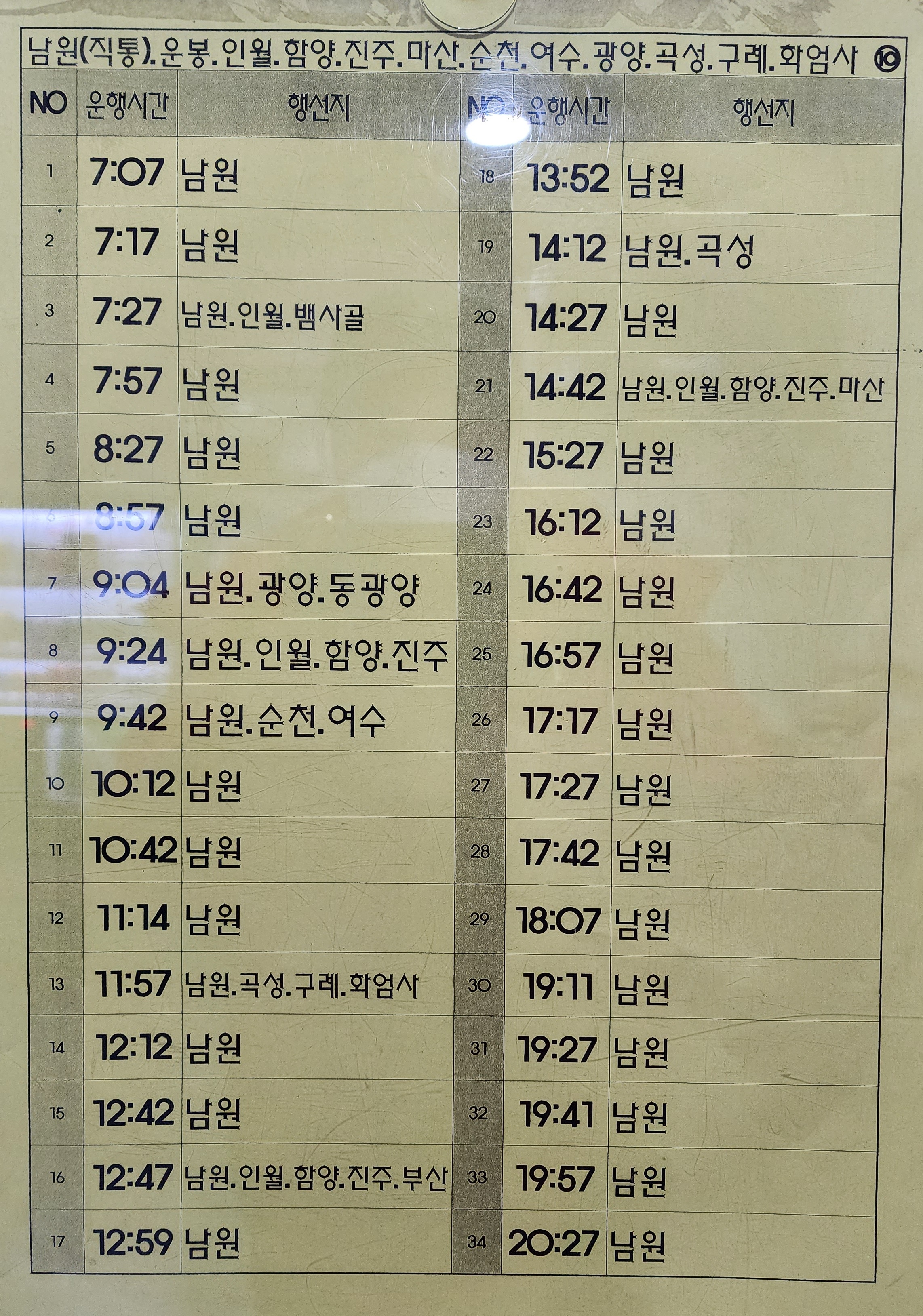 전주 출발 남원, 운봉, 인월, 함양, 진주, 마산, 순천, 여수, 광양, 곡성, 구례, 화엄사 방면.