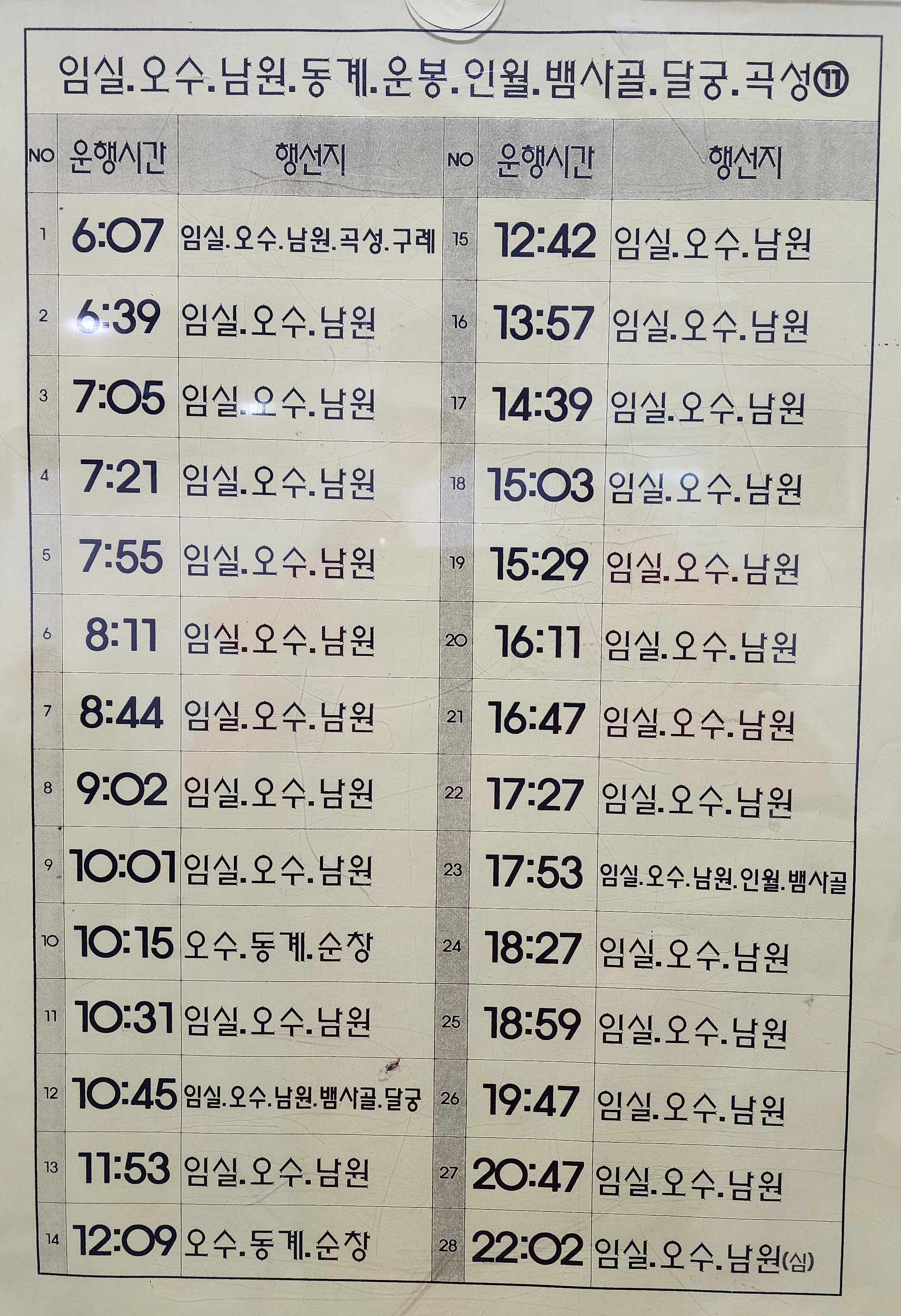전추 출발 임실, 청웅, 강진, 순창, 광주 방면.