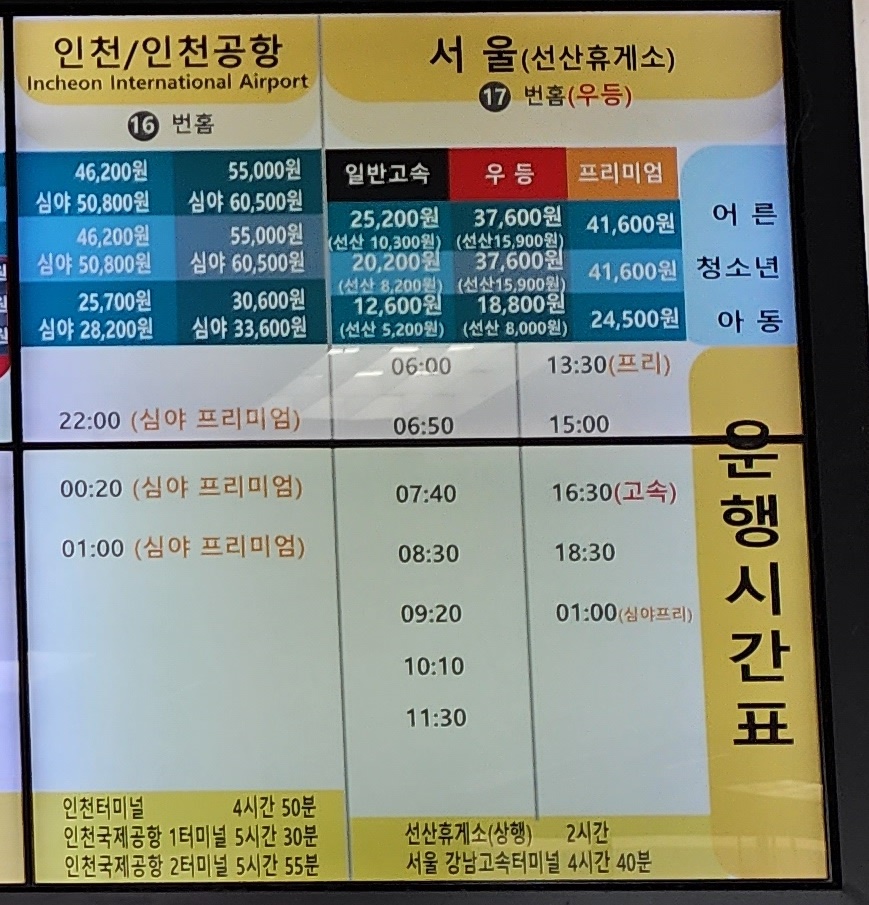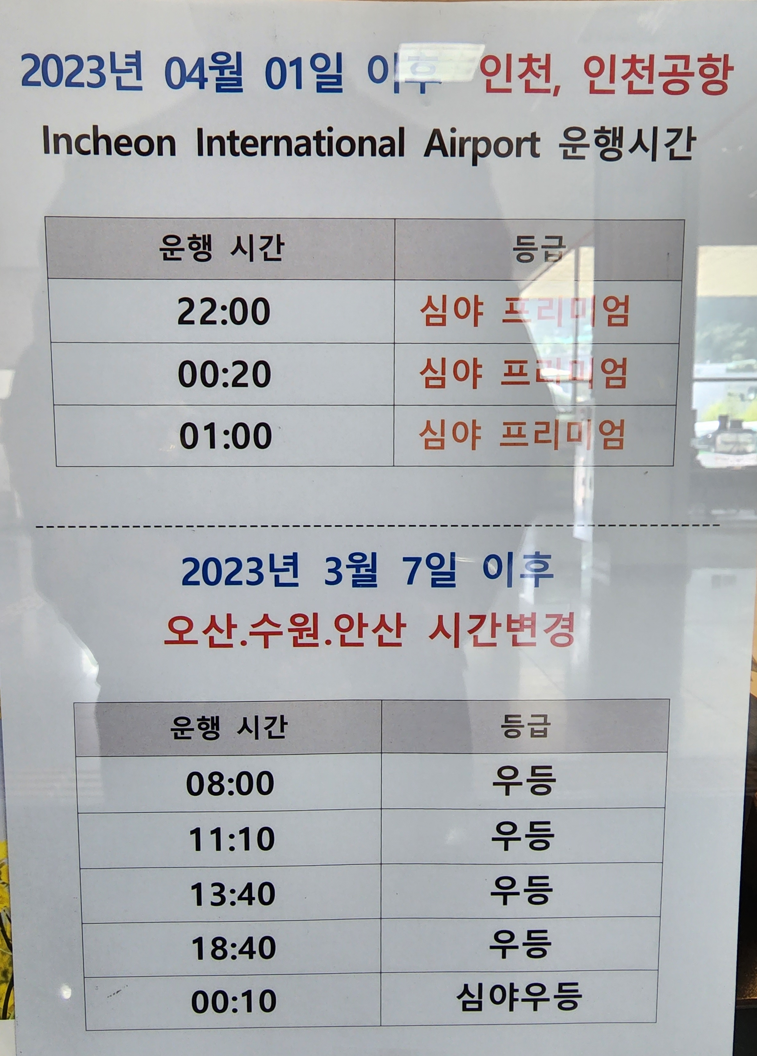 김해 출발 인천, 인천공항, 오산, 안산, 수원 방면.