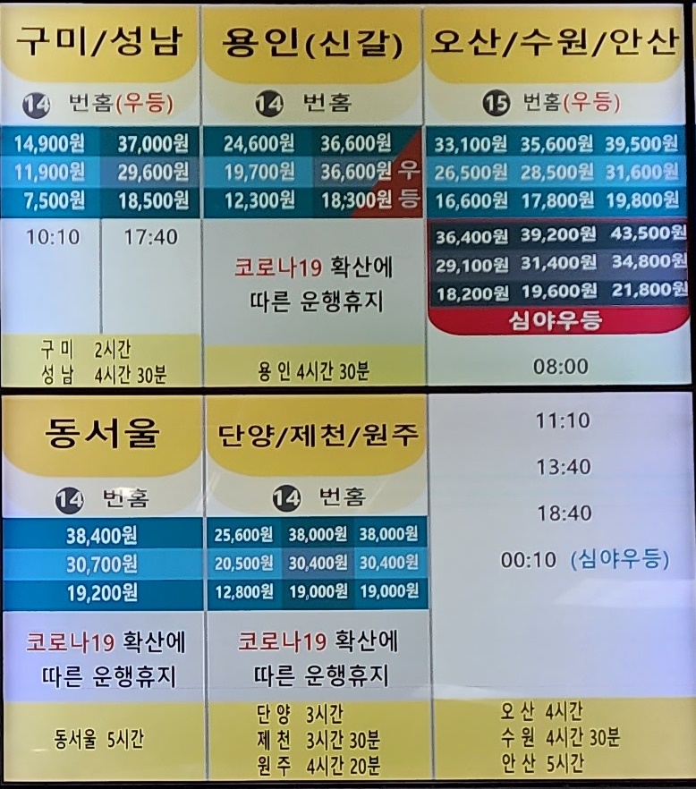 김해 출발 구미, 성남, 용인, 신갈, 오산, 수원, 안산, 동서울, 단양, 제천, 원주 방면.