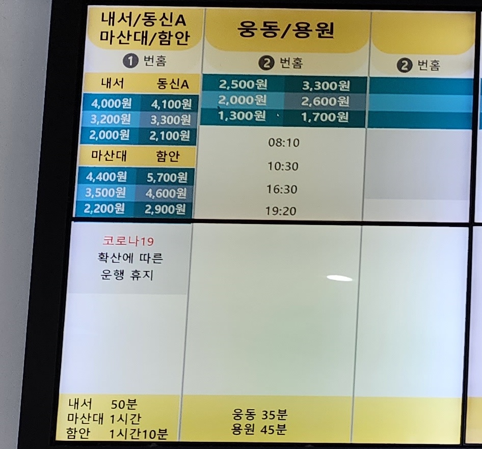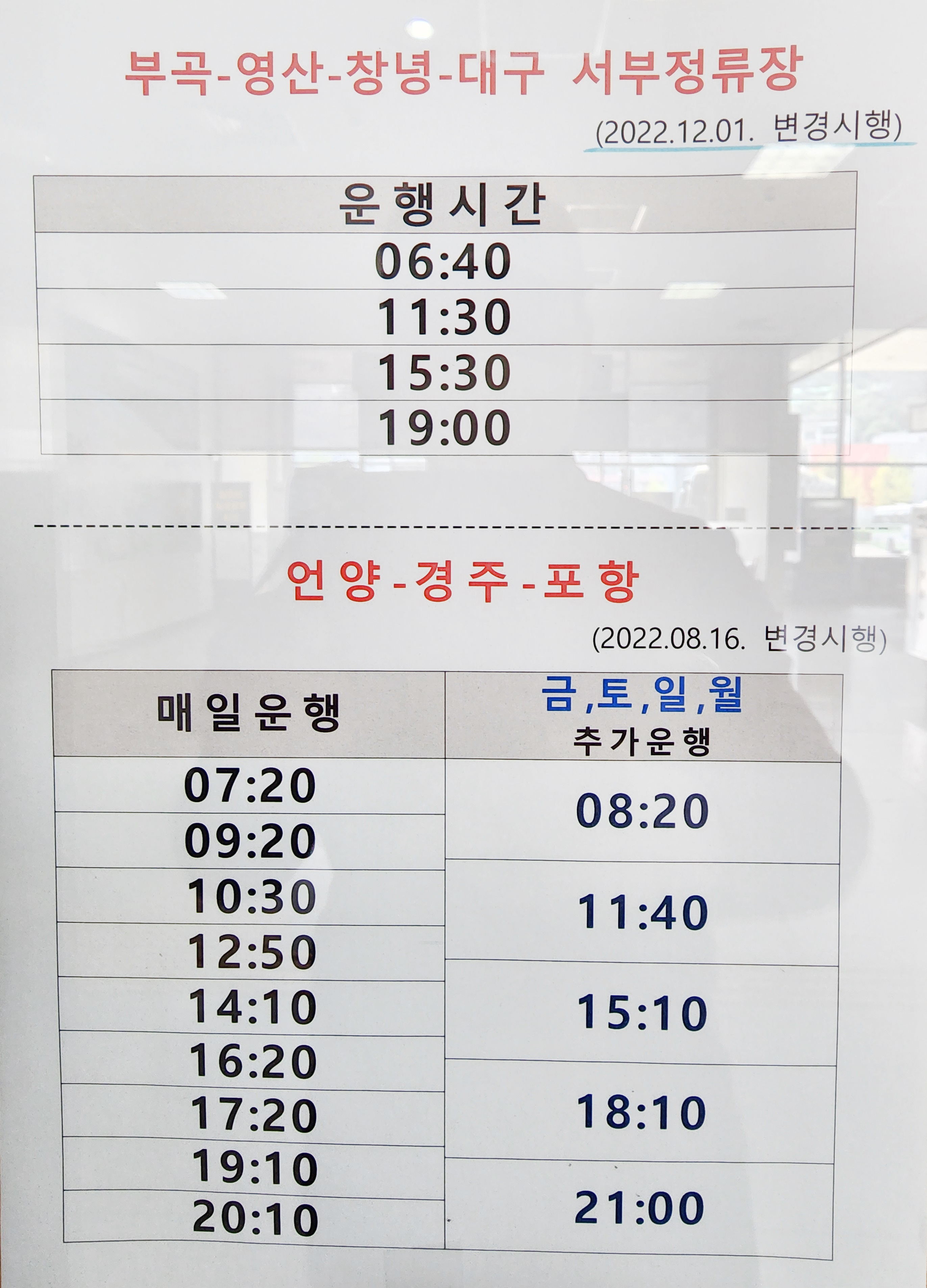 김해 출발 부곡, 영산, 창녕, 대구, 서부정류장, 언양, 경주, 포항 방면.