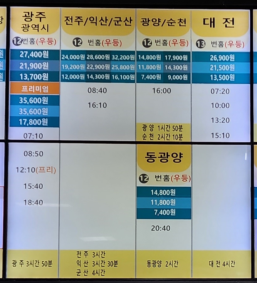 김해 출발 광주, 전주, 익산, 군산, 광양, 동광양, 순천, 대전 방면.