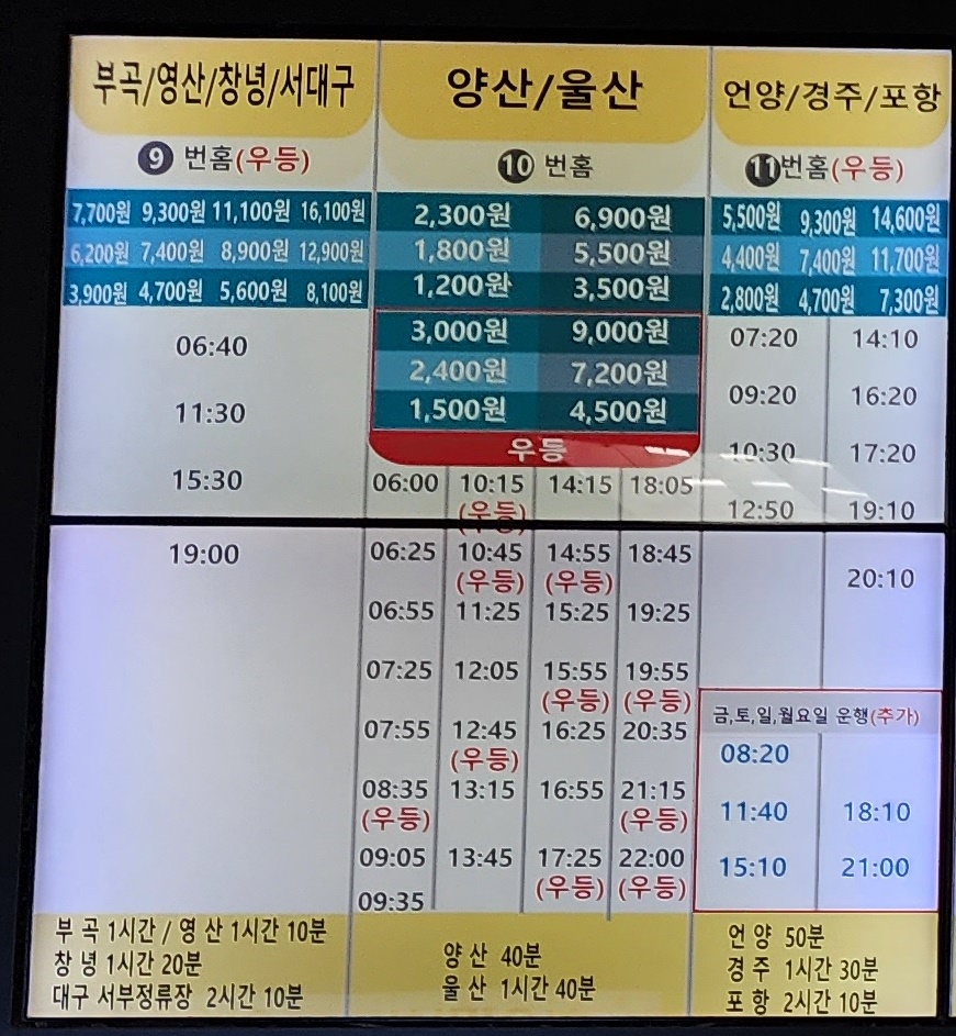 김해 출발 부곡,영산, 창녕, 서대구, 양산, 울산, 언양, 경주, 포항 방면.