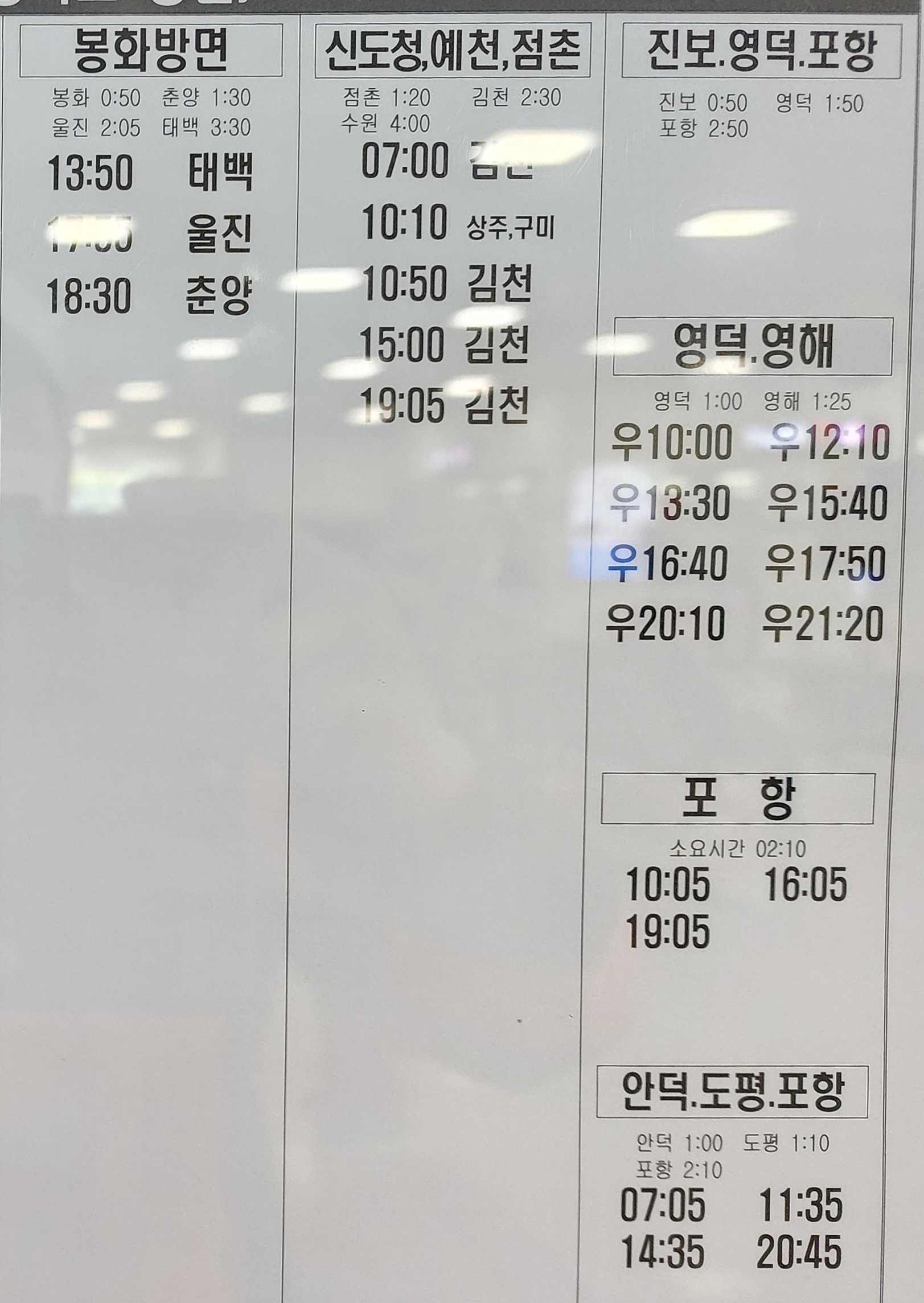안동 출발 봉화, 태백, 울진, 춘양, 신도청, 예천, 점촌, 김천, 진보, 영덕, 포항, 영덕, 영해, 포항, 안덕, 도평 방면.
