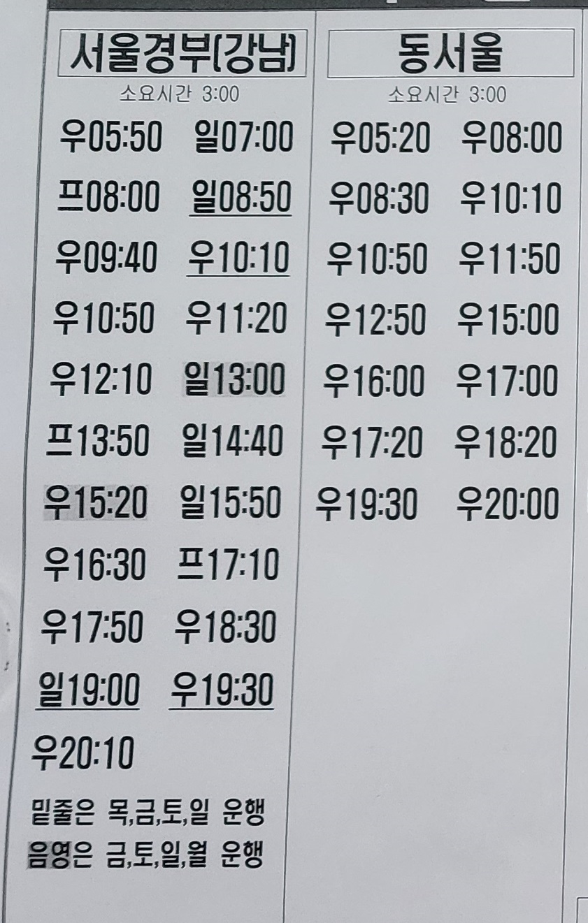 안동 출발 서울경부(강남), 동서울 방면.