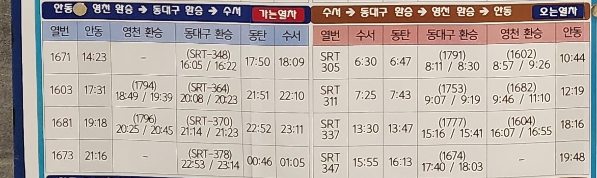 안동 출발 영천 환승, 동대구 환승, 동탄, 수서 방면.