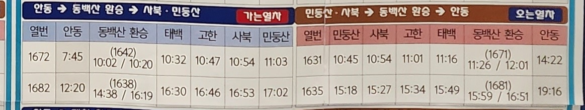 안동 출발 동백산 환승, 태백, 고한, 사북, 민둥산 방면.