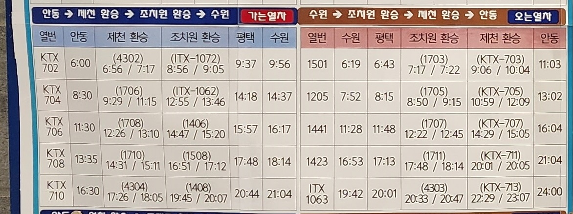 안동 출발 제천 환승, 조치원 환승, 평택, 수원 방면.