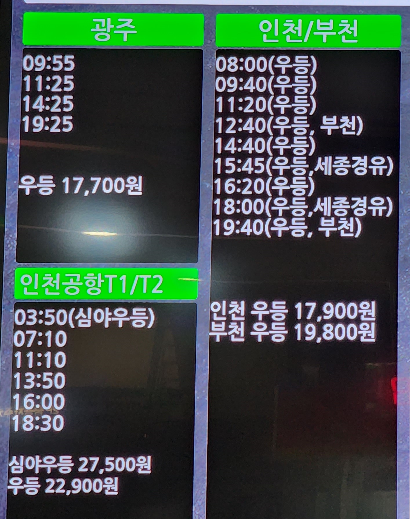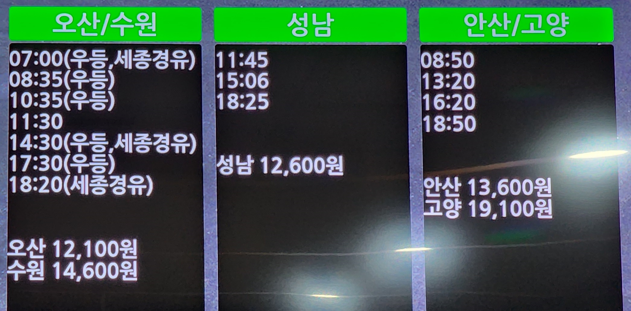 공주 출발 서울경부(강남), 서울남부, 동서울, 세종경유 방면.