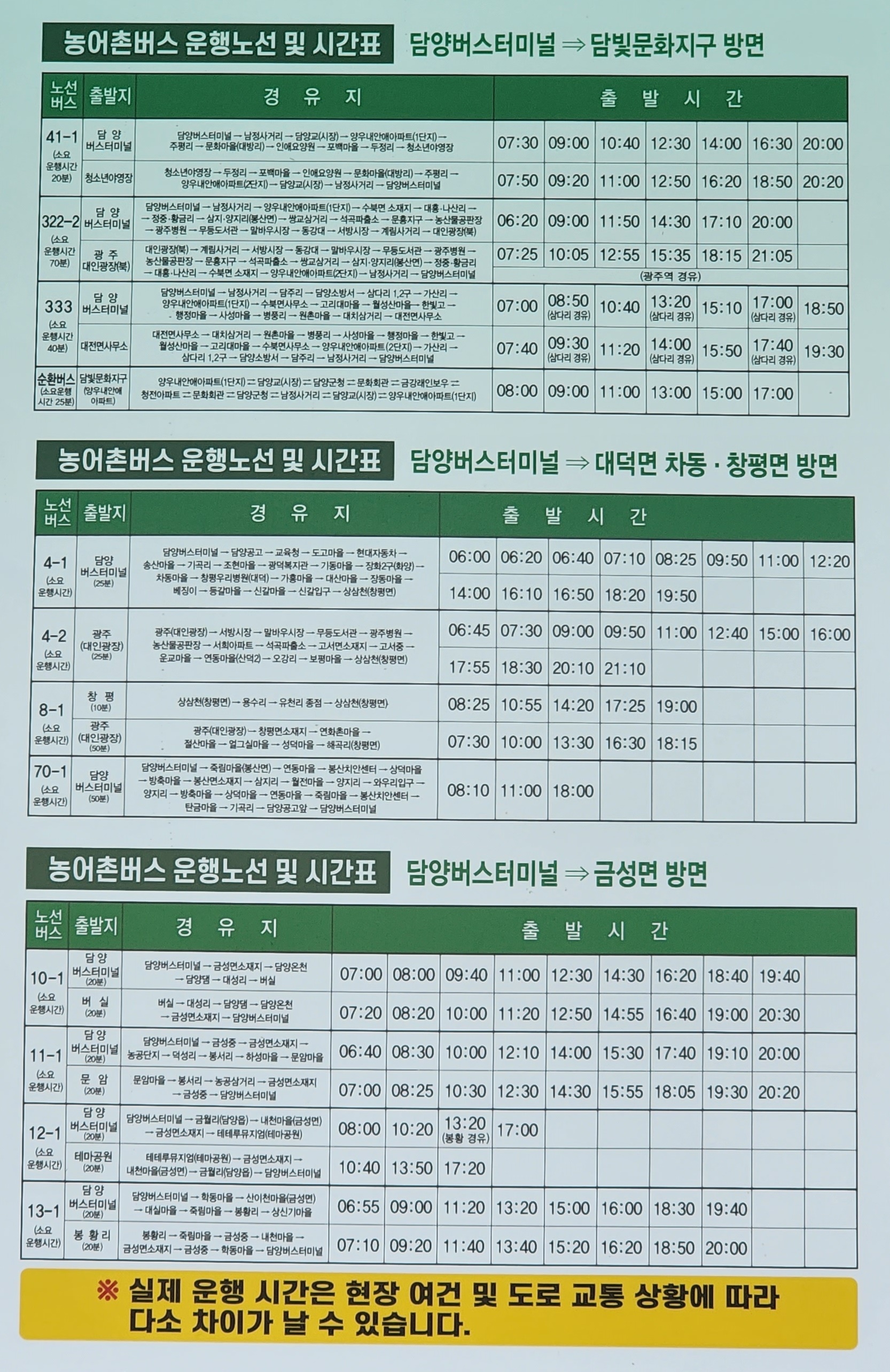 담양 출발 광주, 전남도립대, 메타프로방스, 에코농공단지, 구암, 대추리, 삼지리,