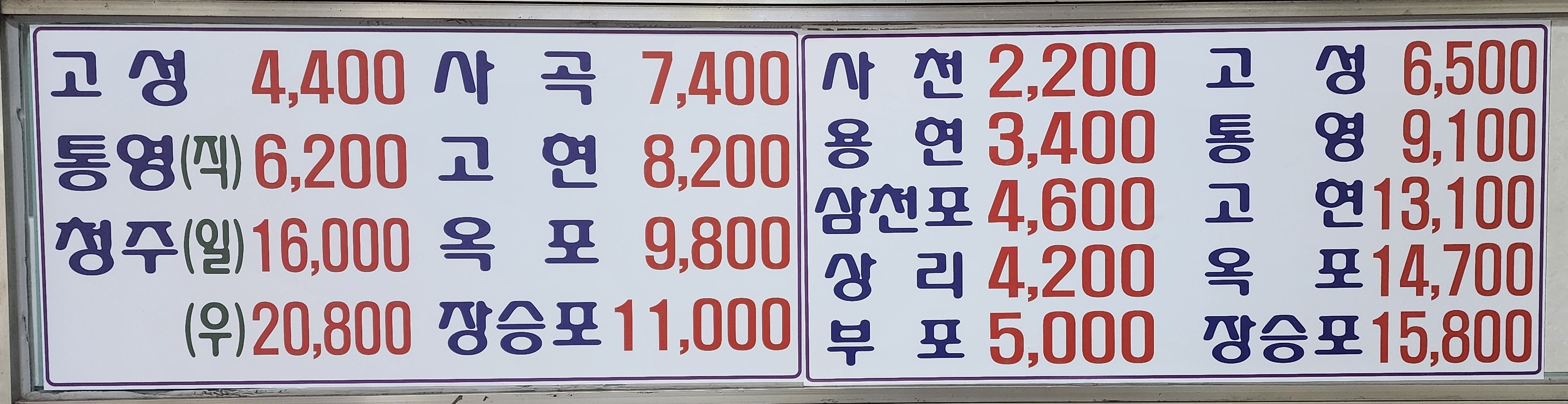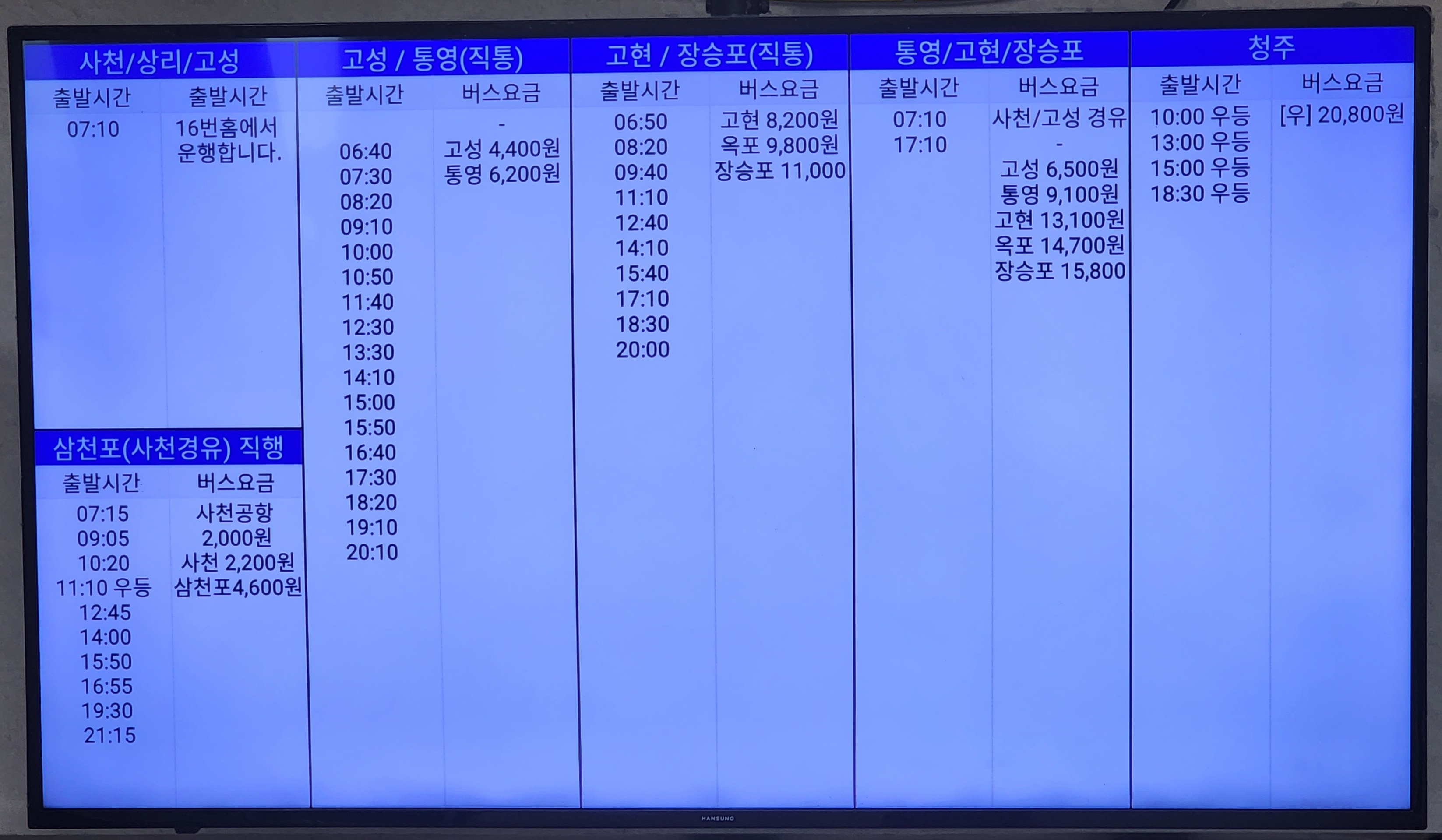 진주 출발 사천, 상리, 고성, 삼천포, 고성, 통영, 고현, 장승포, 청주 방면.