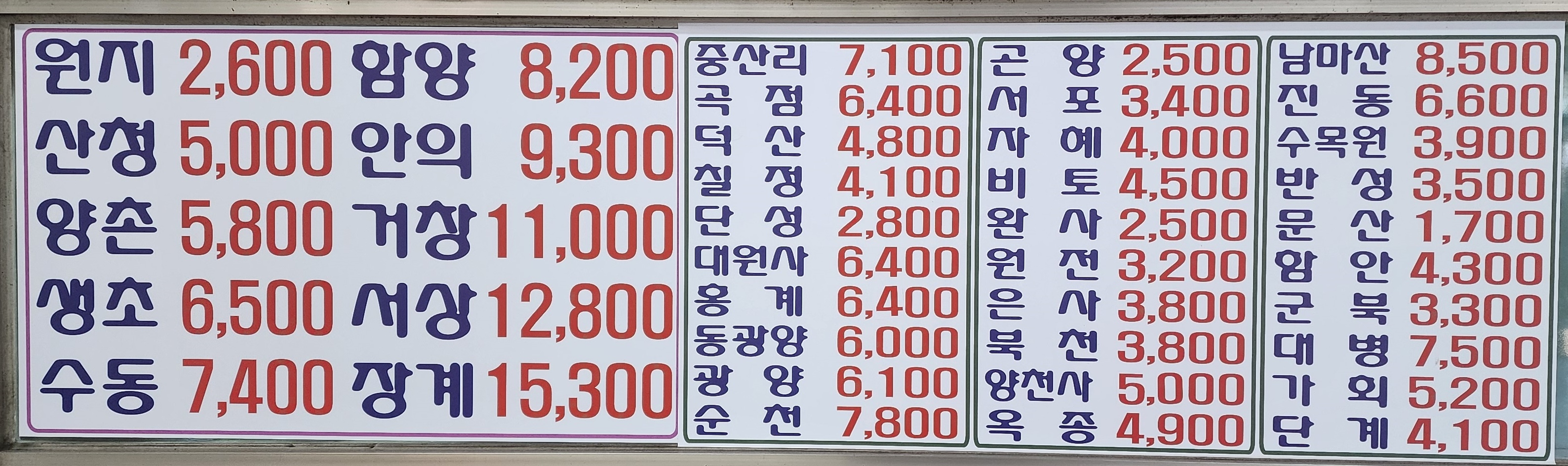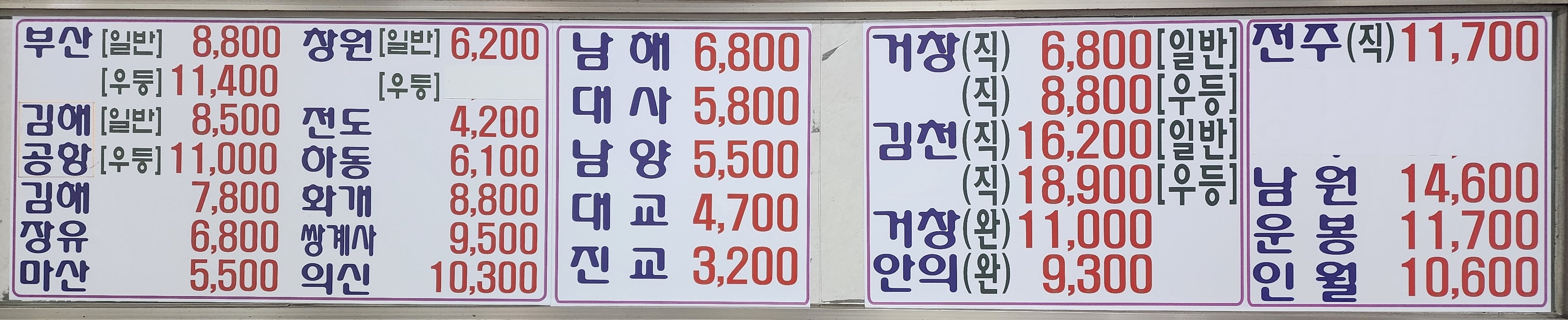 진주 출발 순천, 광양, 의령, 함안, 군북, 삼가, 송계, 대의, 대구 서부, 합천, 대전 복합터미널, 경주, 포항, 삼천포 방면.