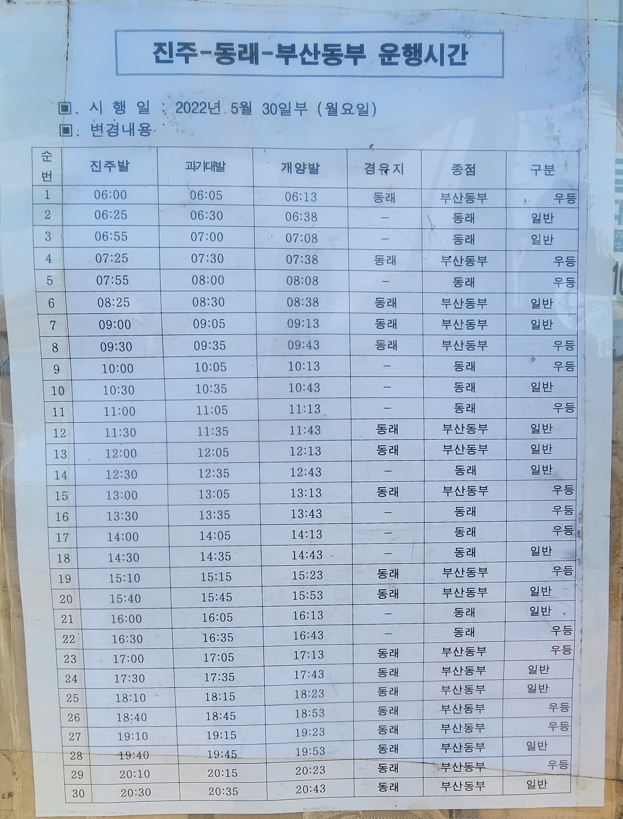 진주 출발 동래ㅡ 부산 동부 노포 방면.