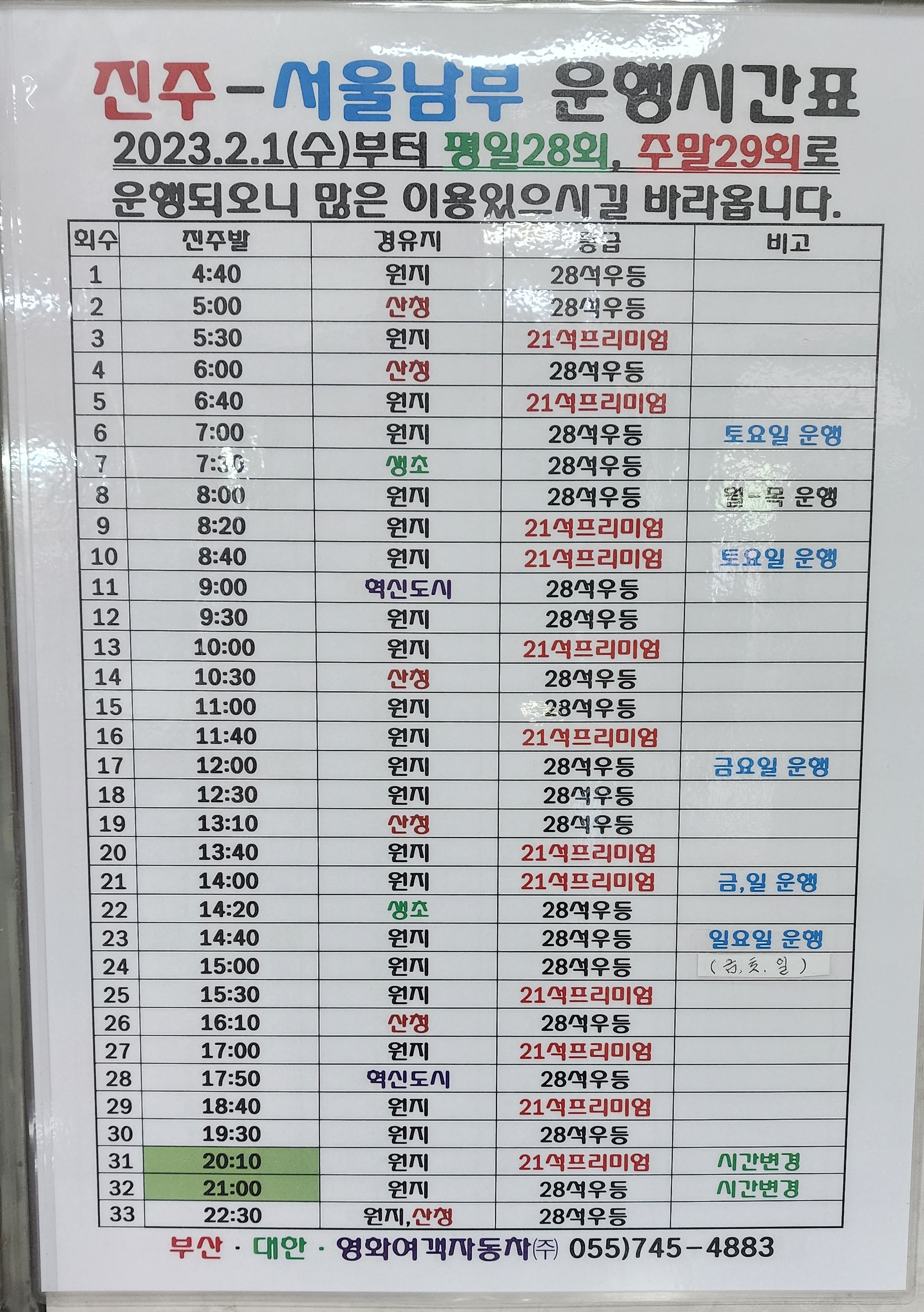 진주 출발 중산리, 청계리, 관정, 대원사, 홍계, 가회, 대병, 완사, 곤양, 옥종, 북천, 서포, 서울 남부터미널, 인천 방면.