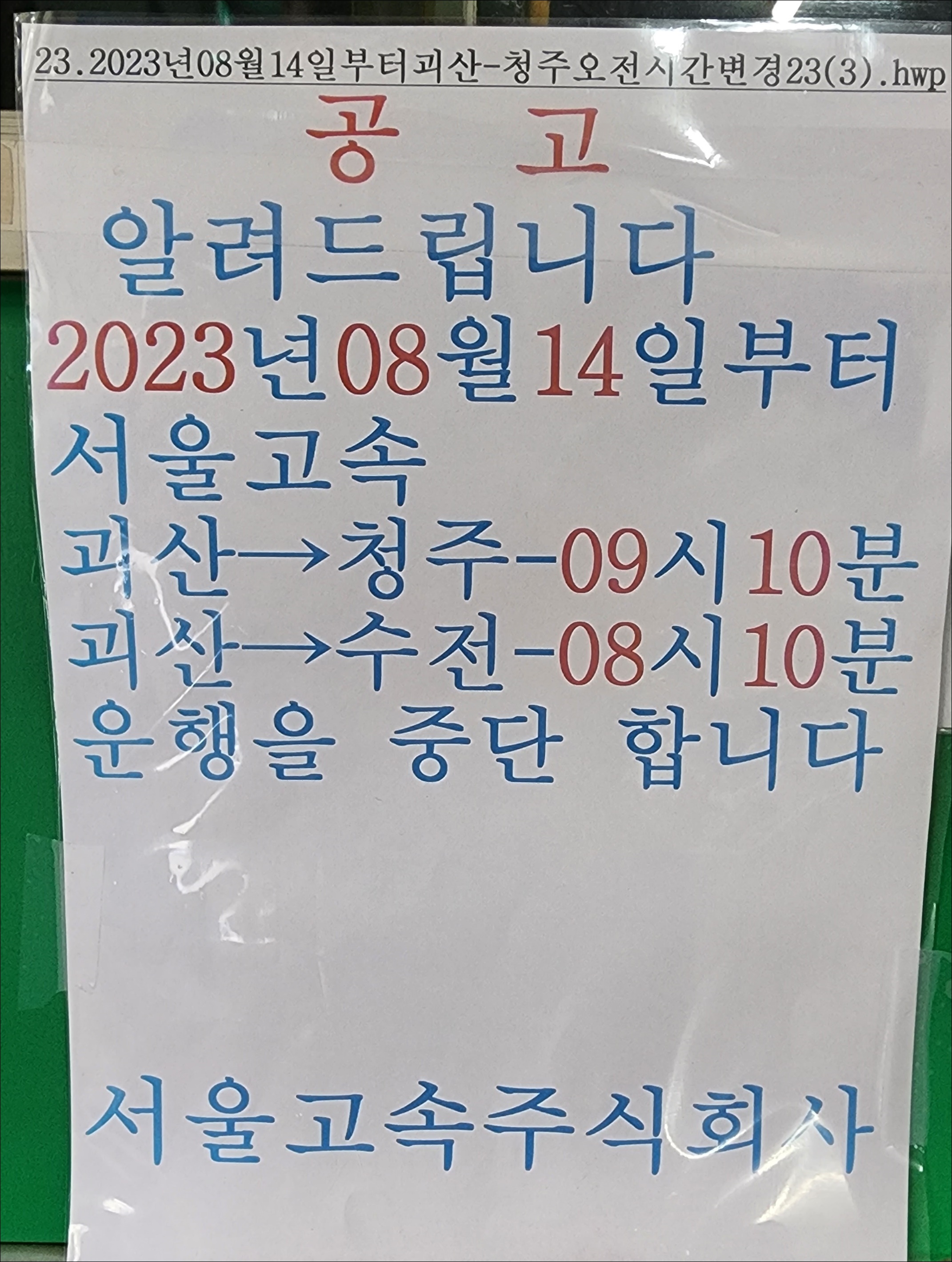2023년 8월 14일부터 괴산 출발 청주 오전시간표 변경