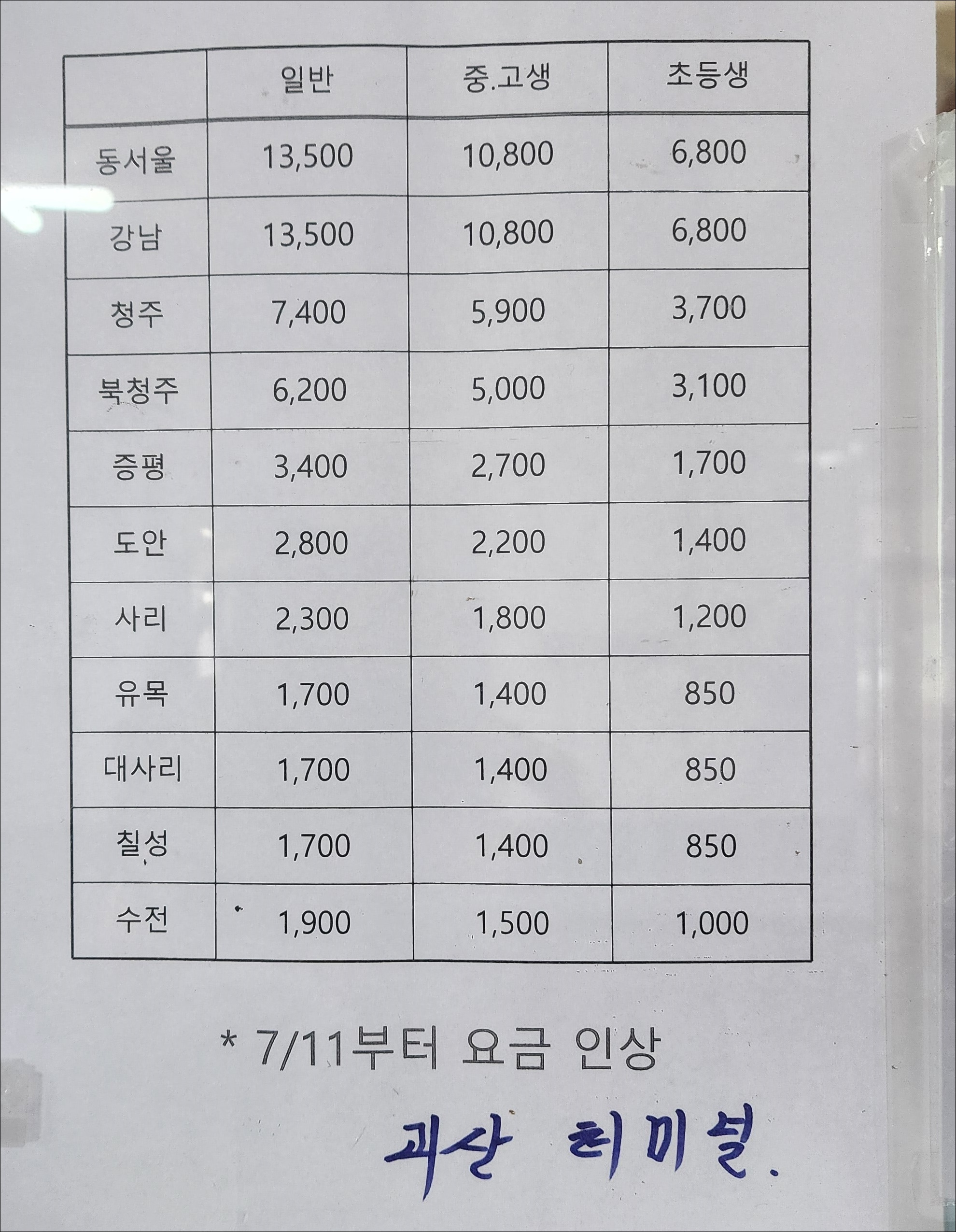 괴산 출발 동서울, 강남센트럴, 청주, 칠성, 수전 방면.