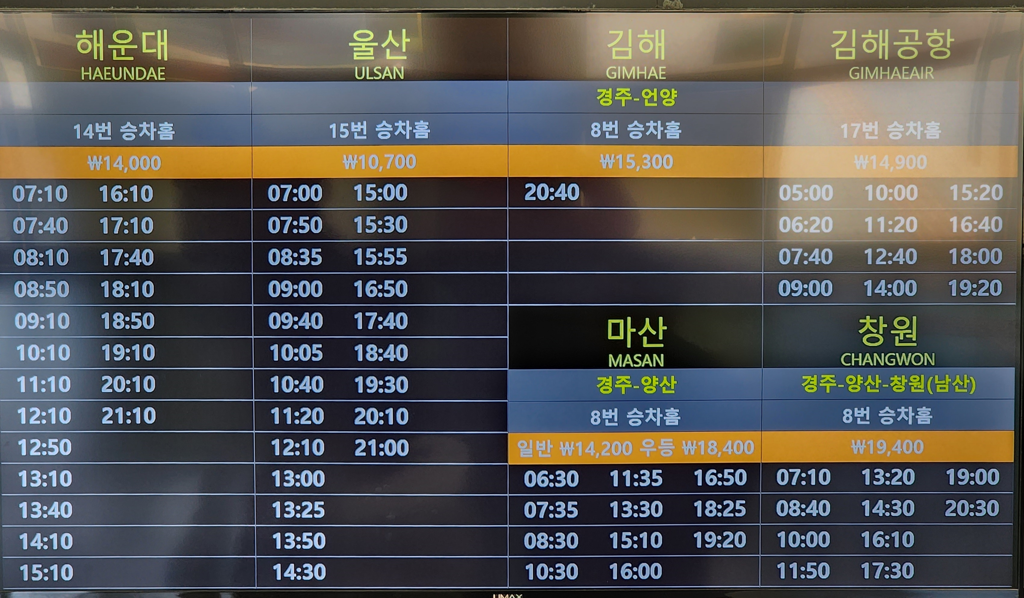 포항 출발, 해운대, 울산, 김해, 김해공항, 마산, 창원 방면.