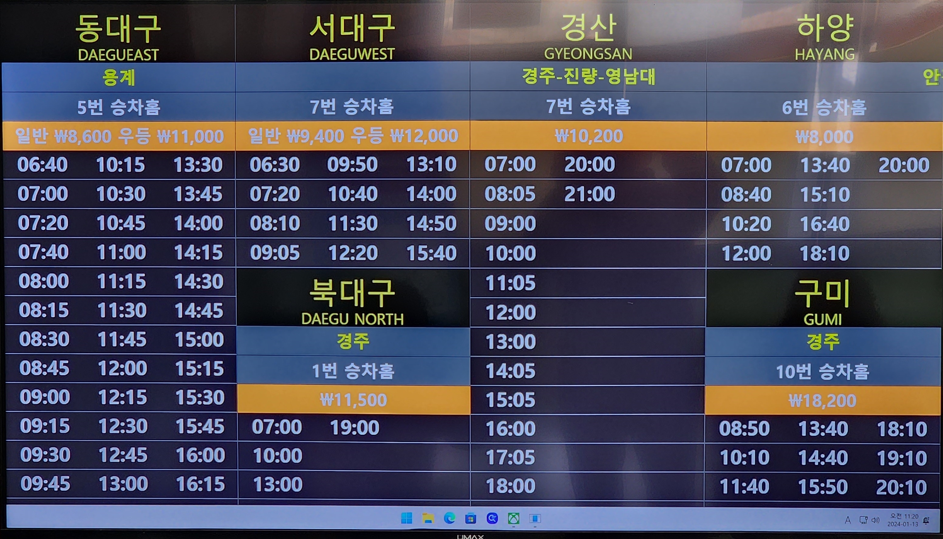 포항 출발 울진,춭천, 부산동부 노포, 부산서부 사상 방면.