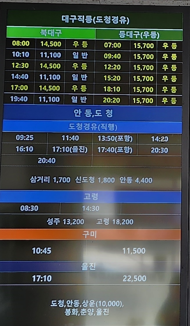 예천 출발 대구, 북대구, 동대구, 안동, 경북도청, 고령, 구미, 울진 방면.