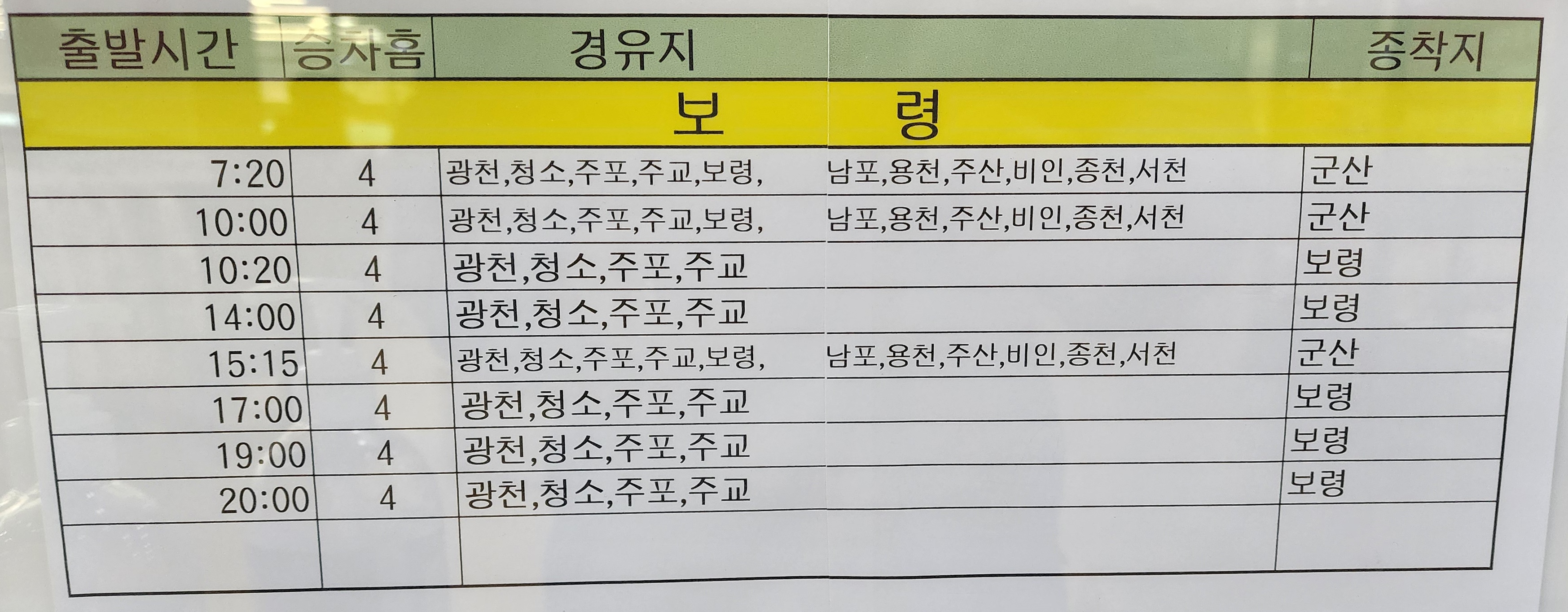 총성 출발 서산 방면 요금표