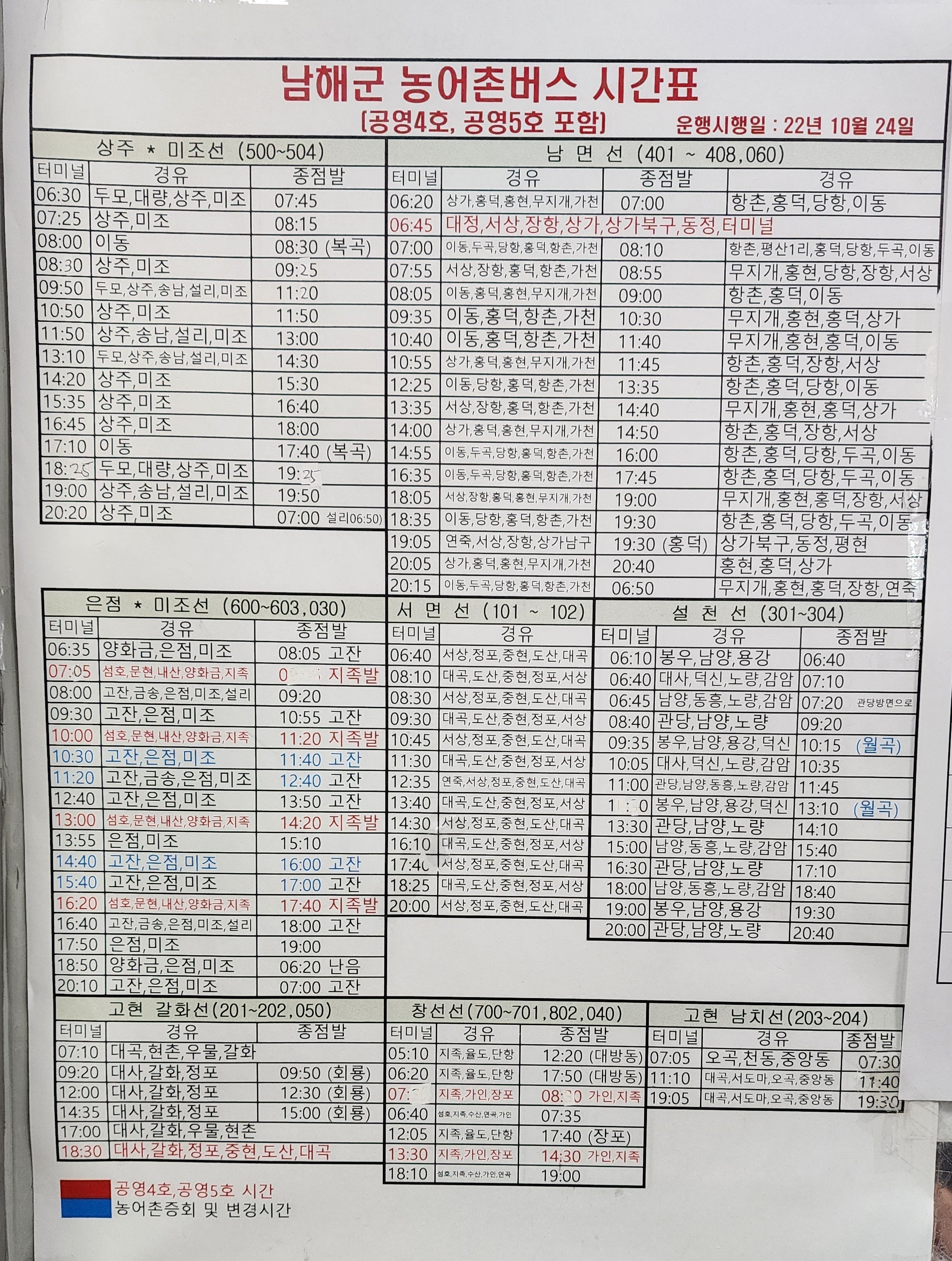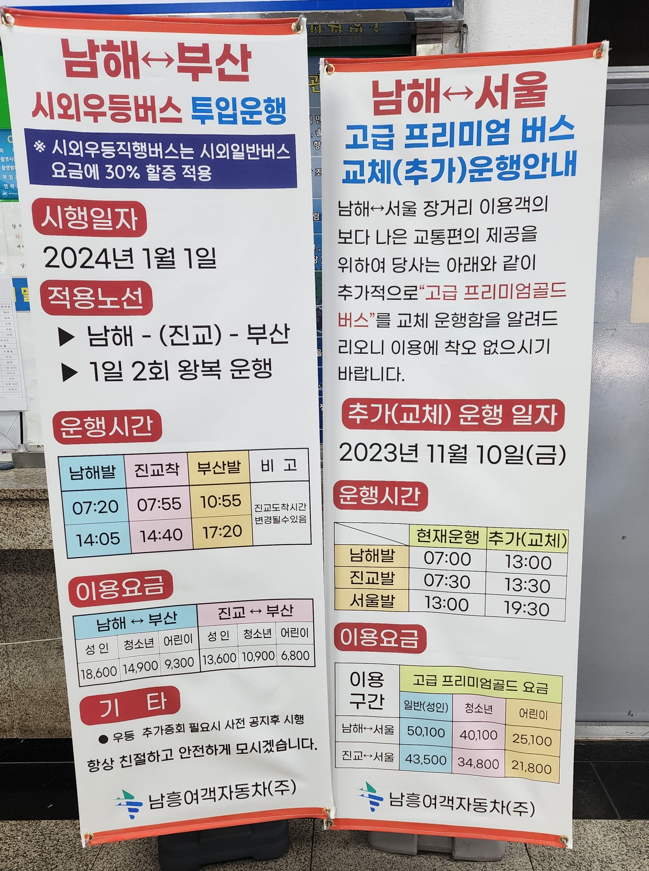 남해 출발 부산, 진주, 마산, 창원, 대전, 서울 방면.