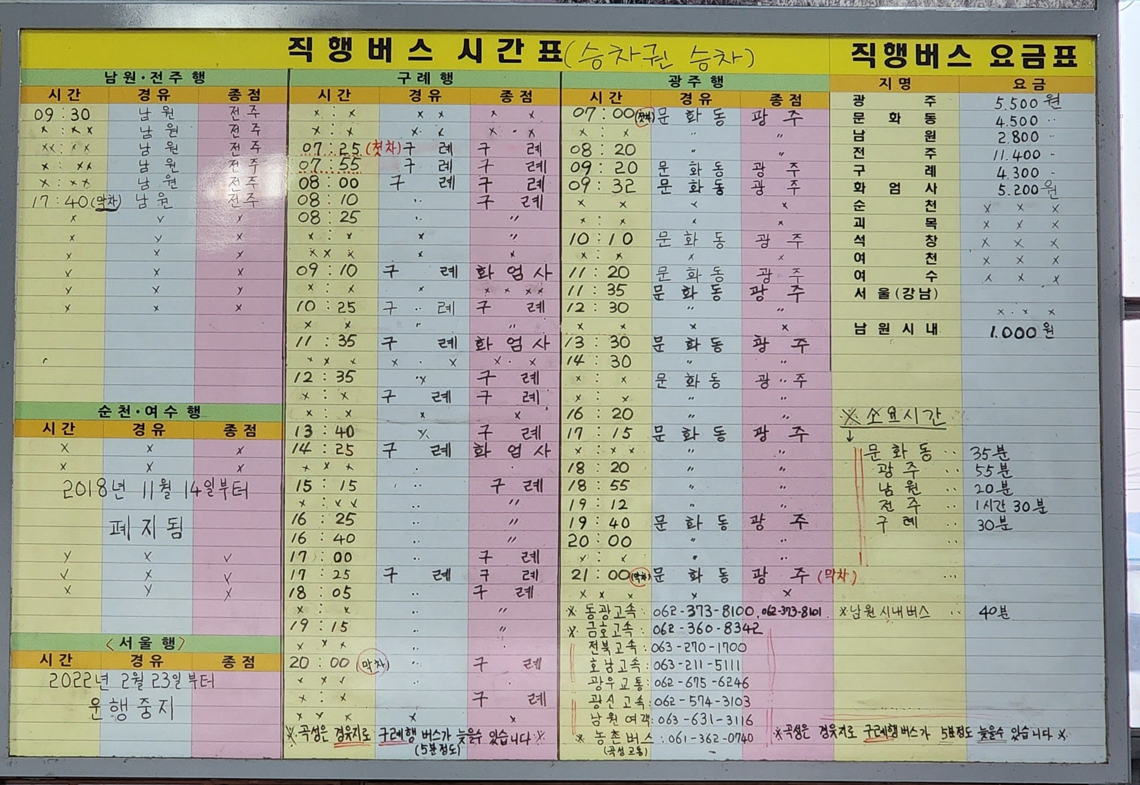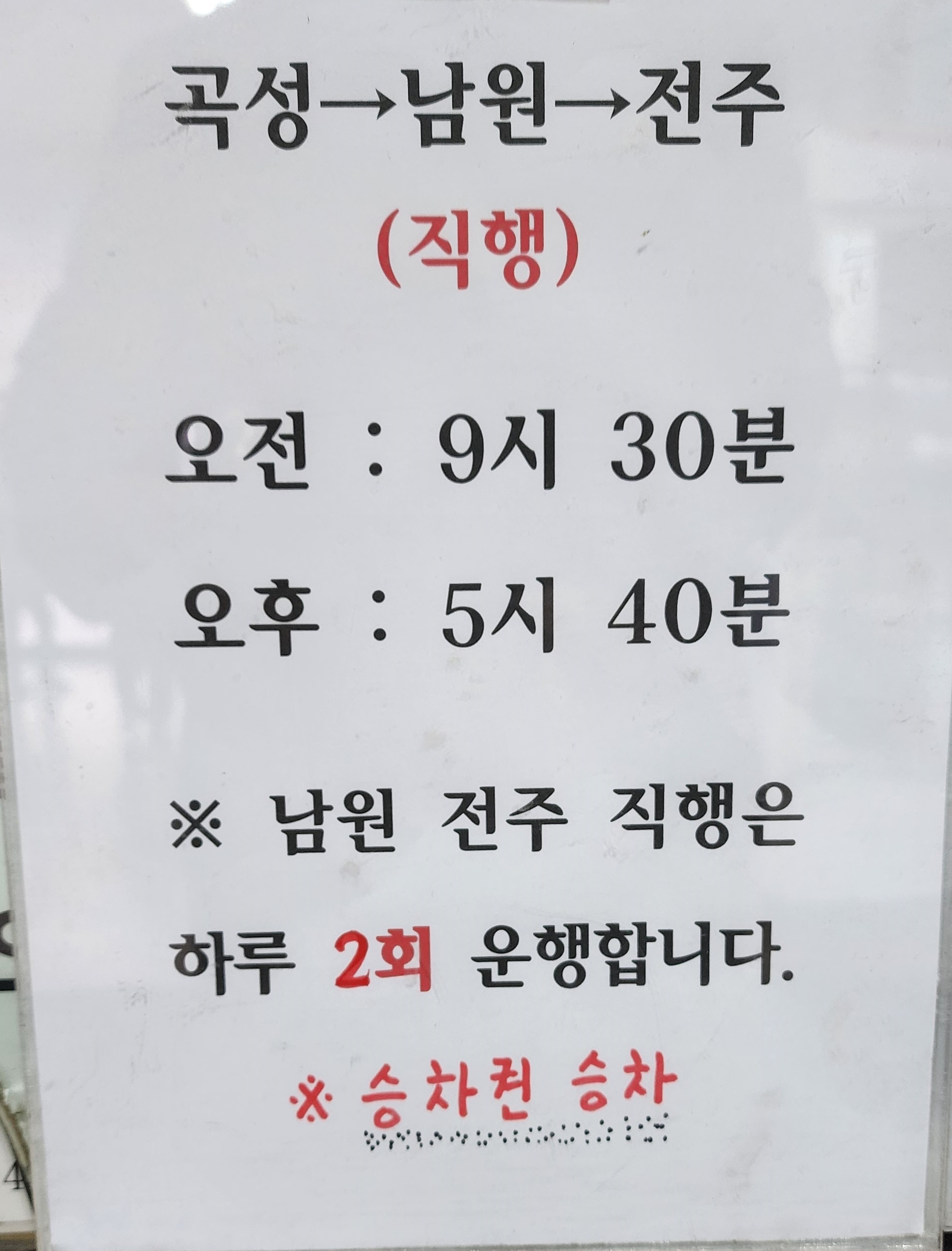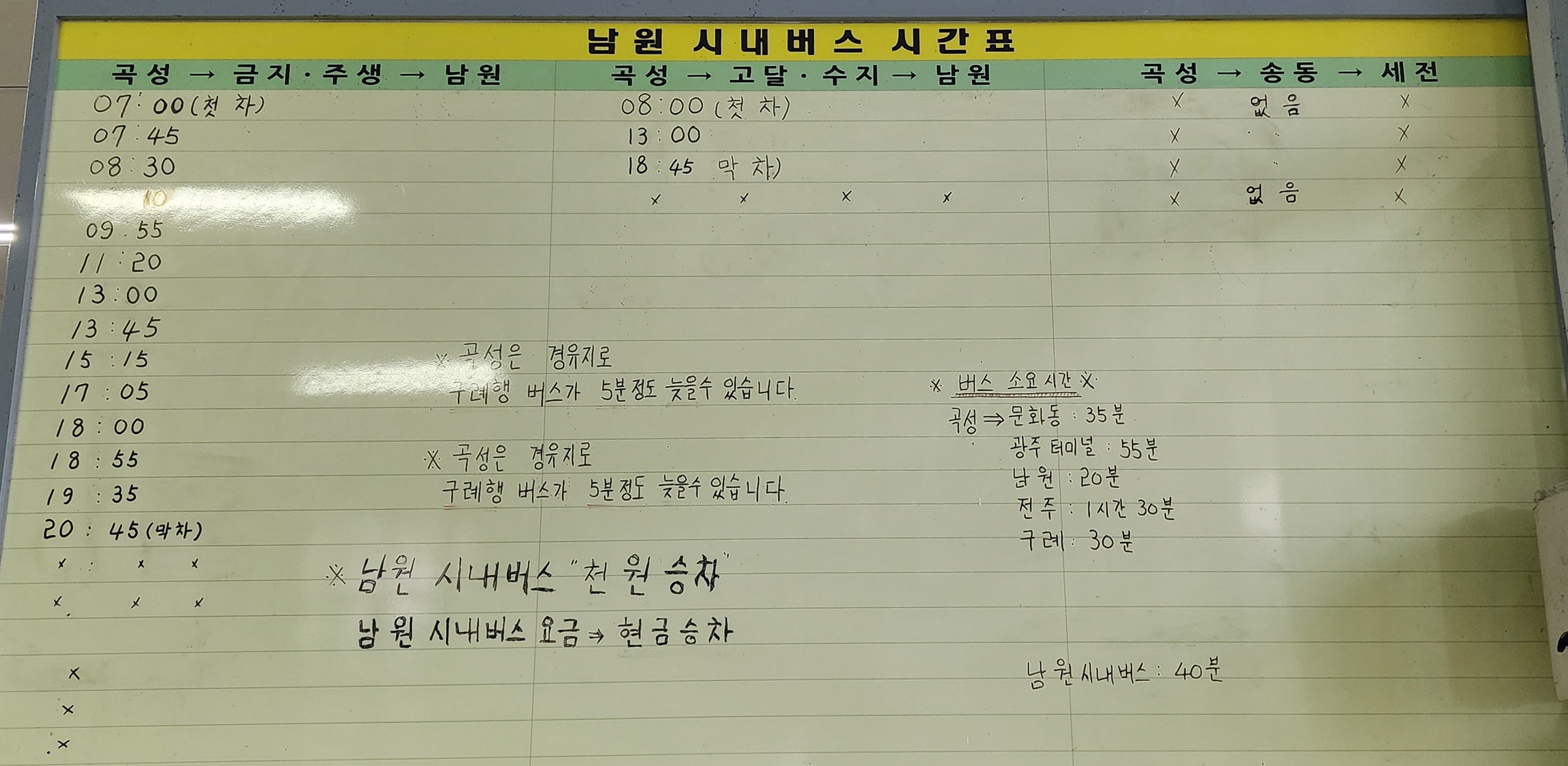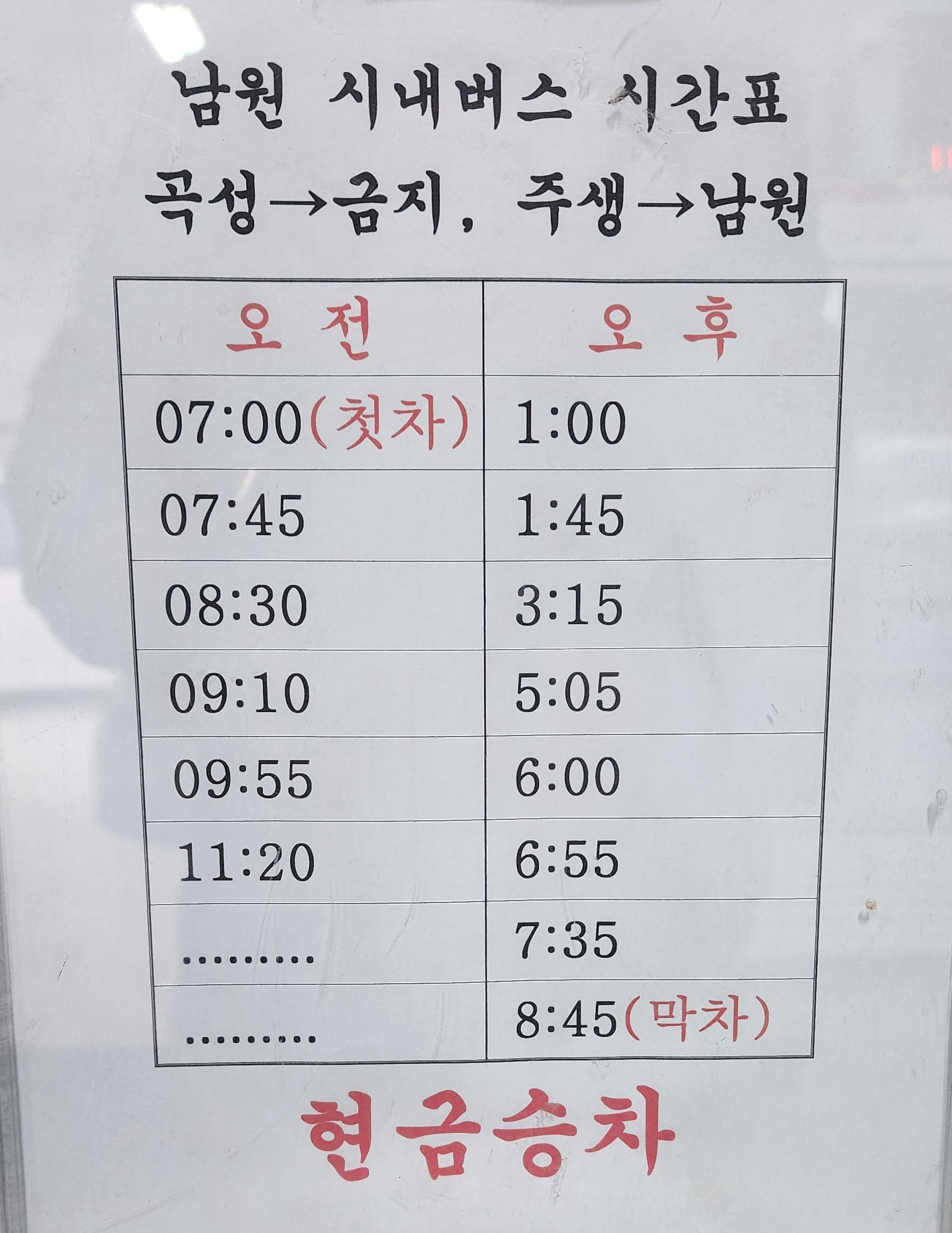 남원 시내버스 시간표 곡성 출발 금지, 주생, 남원 방면.