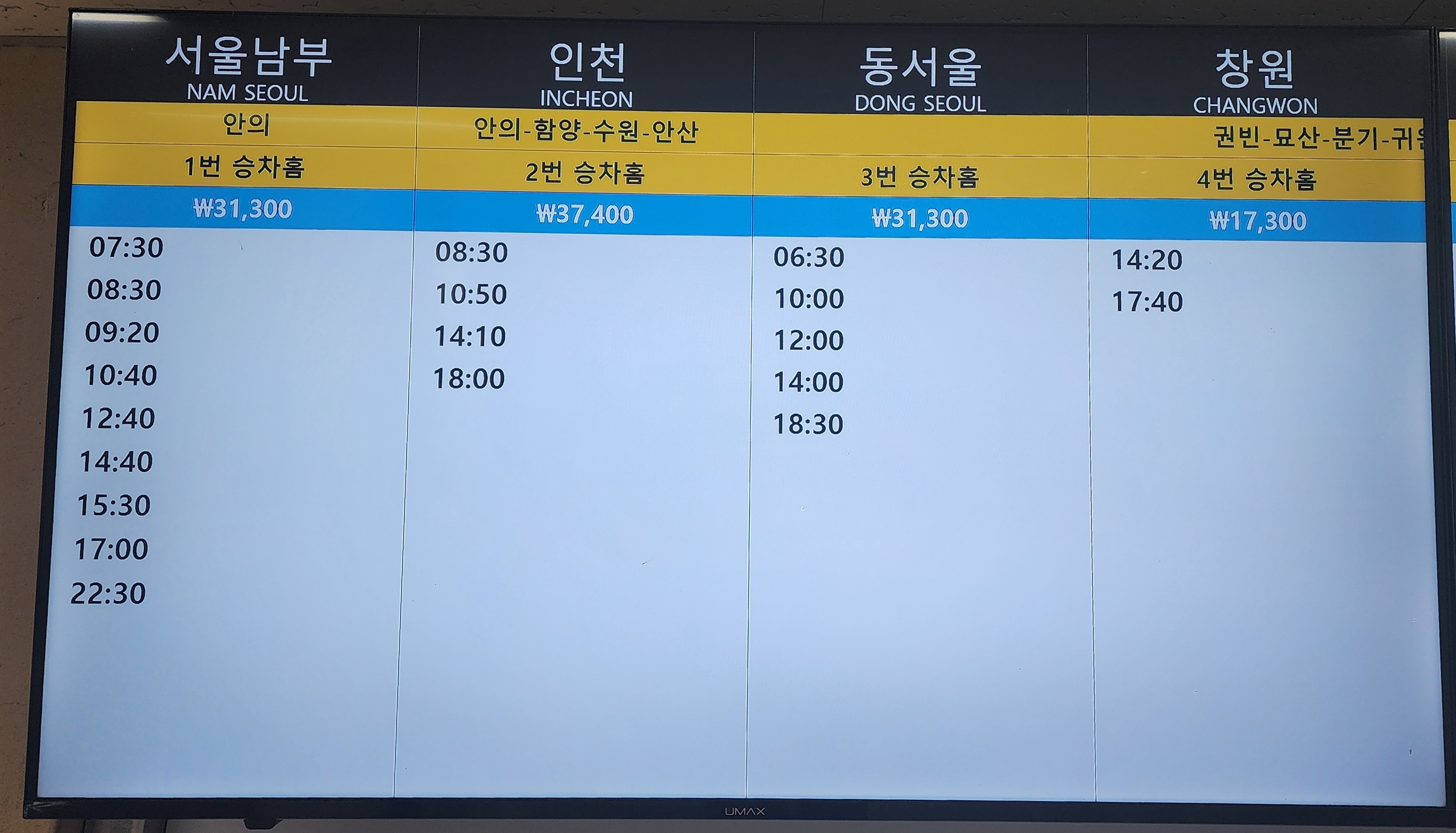 거창 출발 서울 남부, 인천, 동서울, 창원 방면.