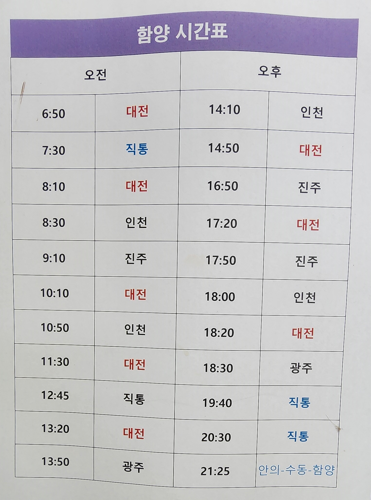 거창 출발 함양 시간표